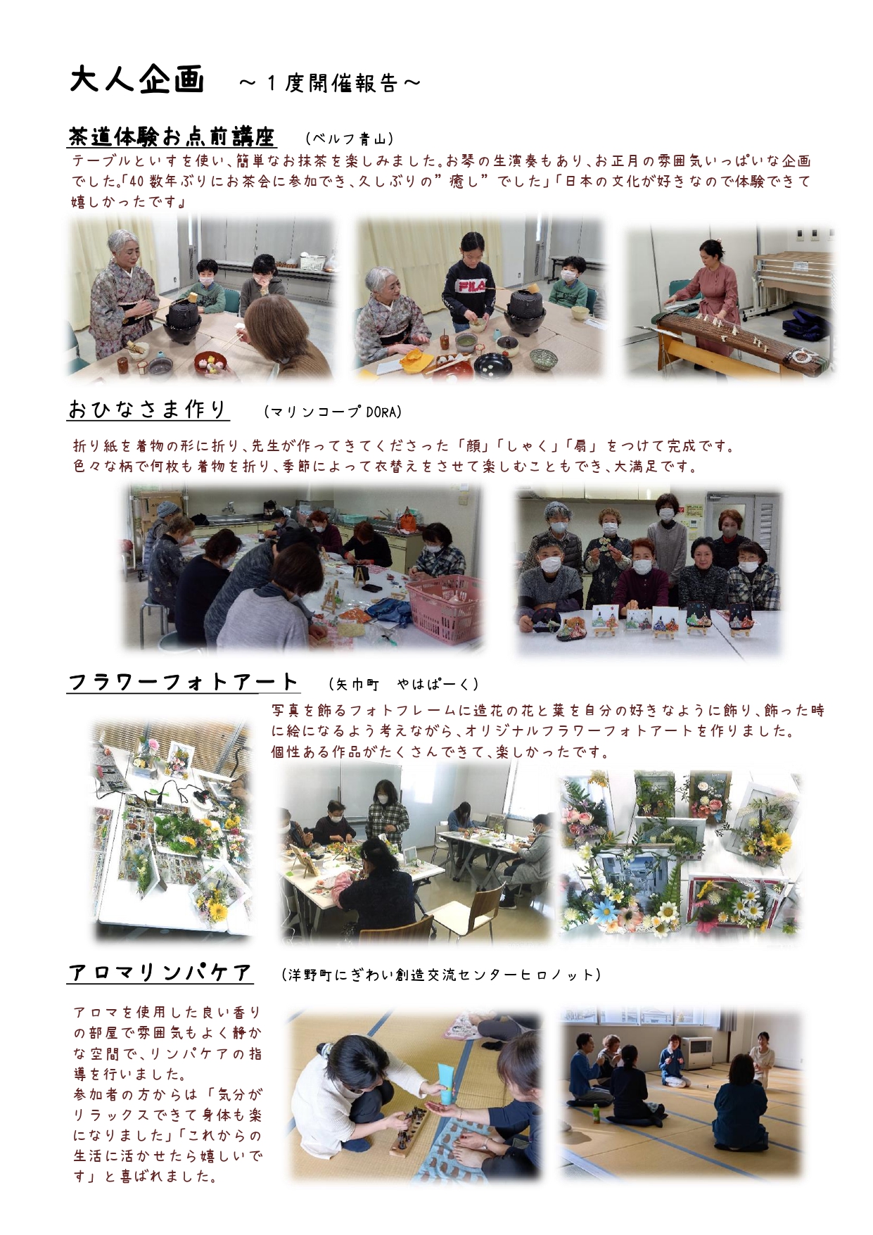 大人企画とは…シニアのいきいきとしたくらし・健康づくりのために、「大人企画」を多彩な内容で、生協の店舗や地域公民館などで開催しています。 1月は県内各地で17企画を行い、156人の参加でした。その一部をご紹介します。