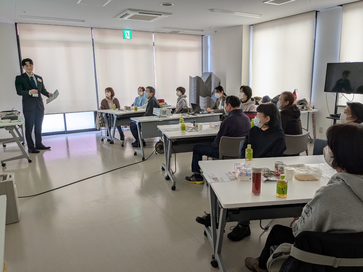 いわて生協のお店を会場に、災害時の食品の備えを学ぶ講座を開催、3月17日(月)ベルフ青山で8人、18日(火)ベルフ牧野林で11人が参加しました。