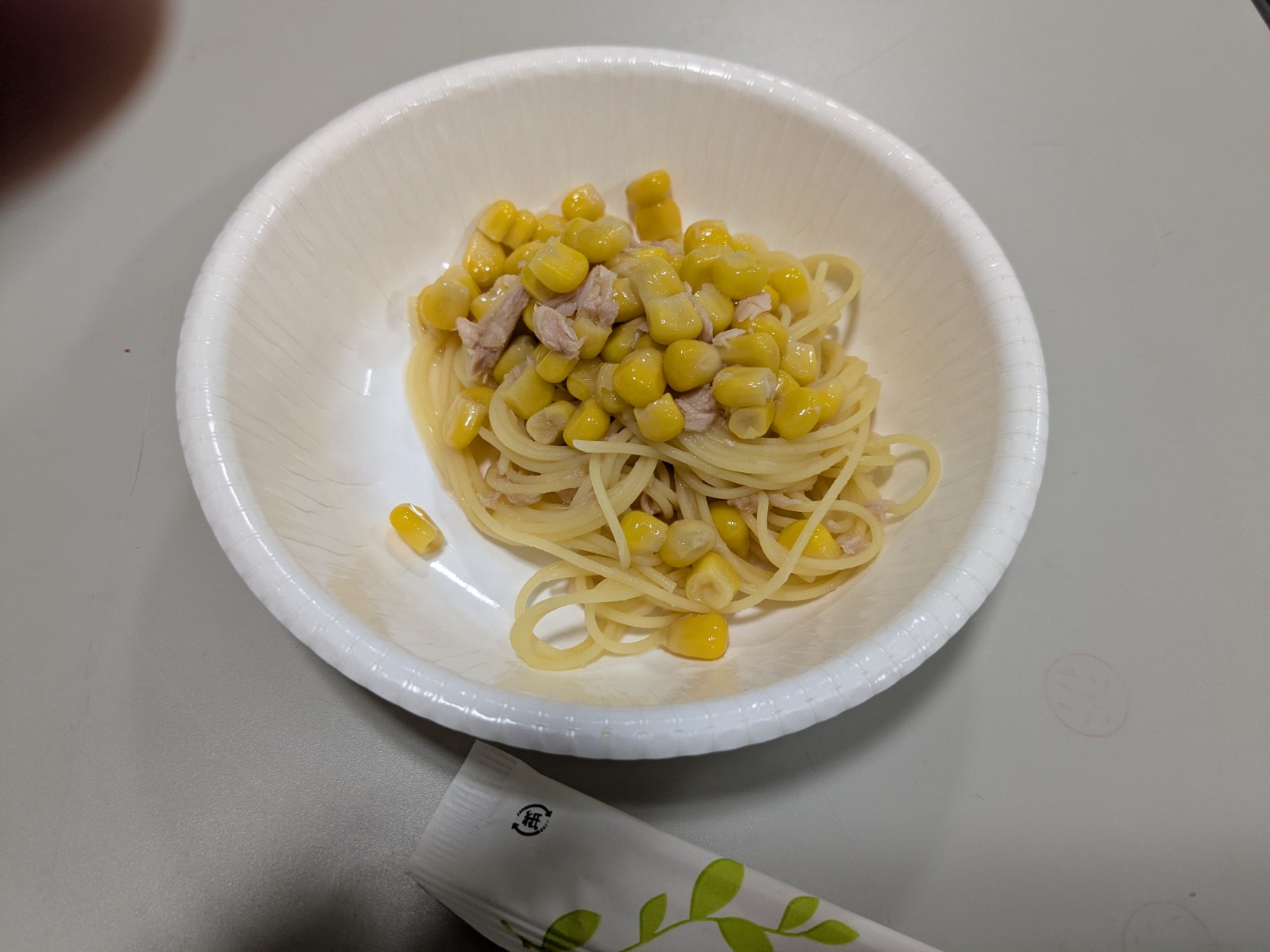 乾麺のパスタ、コーン水煮缶詰(液ごと)を高密度ポリエチレン袋に入れ、少しの水(100ml)を加えてお湯の中に入れ、火が通ったらシーチキンを混ぜてしょうゆで味を調えて完成です。