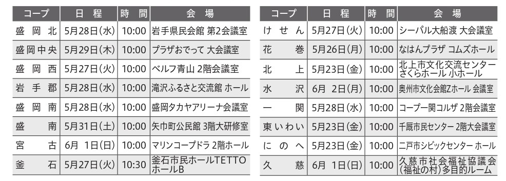 コープ総代会は通常総代会の事前討議の場として、県内16会場で開催します。役員が出席し、議案の提案を行いますので、総代のみなさんはぜひ出席をお願いします。また、総代以外の組合員の方もご参加いただけます。
