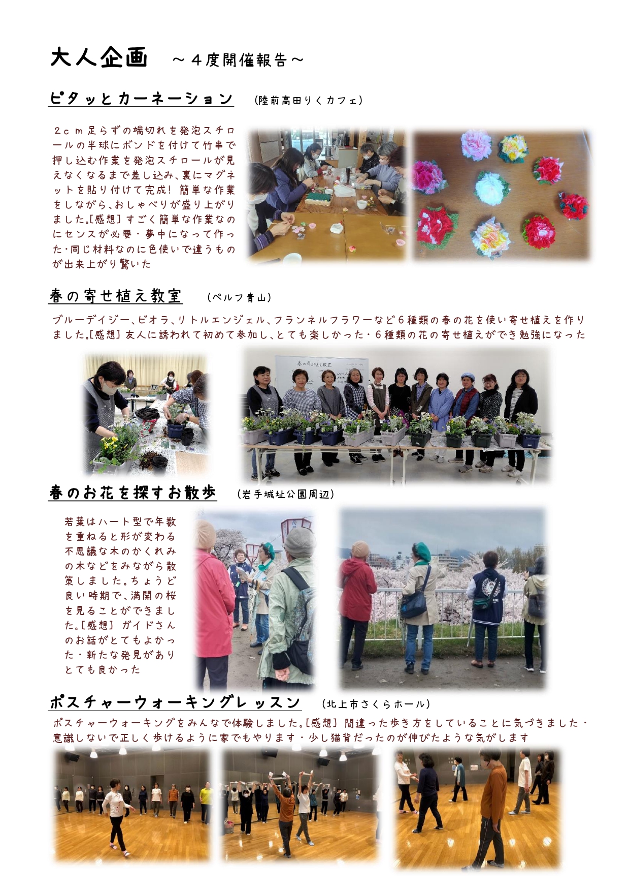 大人企画とは…シニアのいきいきとしたくらし・健康づくりのために、「大人企画」を多彩な内容で、生協の店舗や地域公民館などで開催しています。 4月は県内各地で17企画を行い、138人の参加でした。その一部をご紹介します。