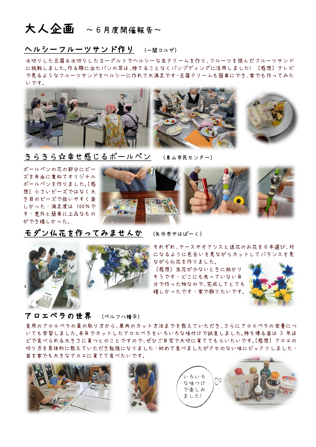 大人企画とは…シニアのいきいきとしたくらし・健康づくりのために、「大人企画」を多彩な内容で、生協の店舗や地域公民館などで開催しています。 6月は県内各地で17企画を行い、167人の参加でした。その一部をご紹介します。