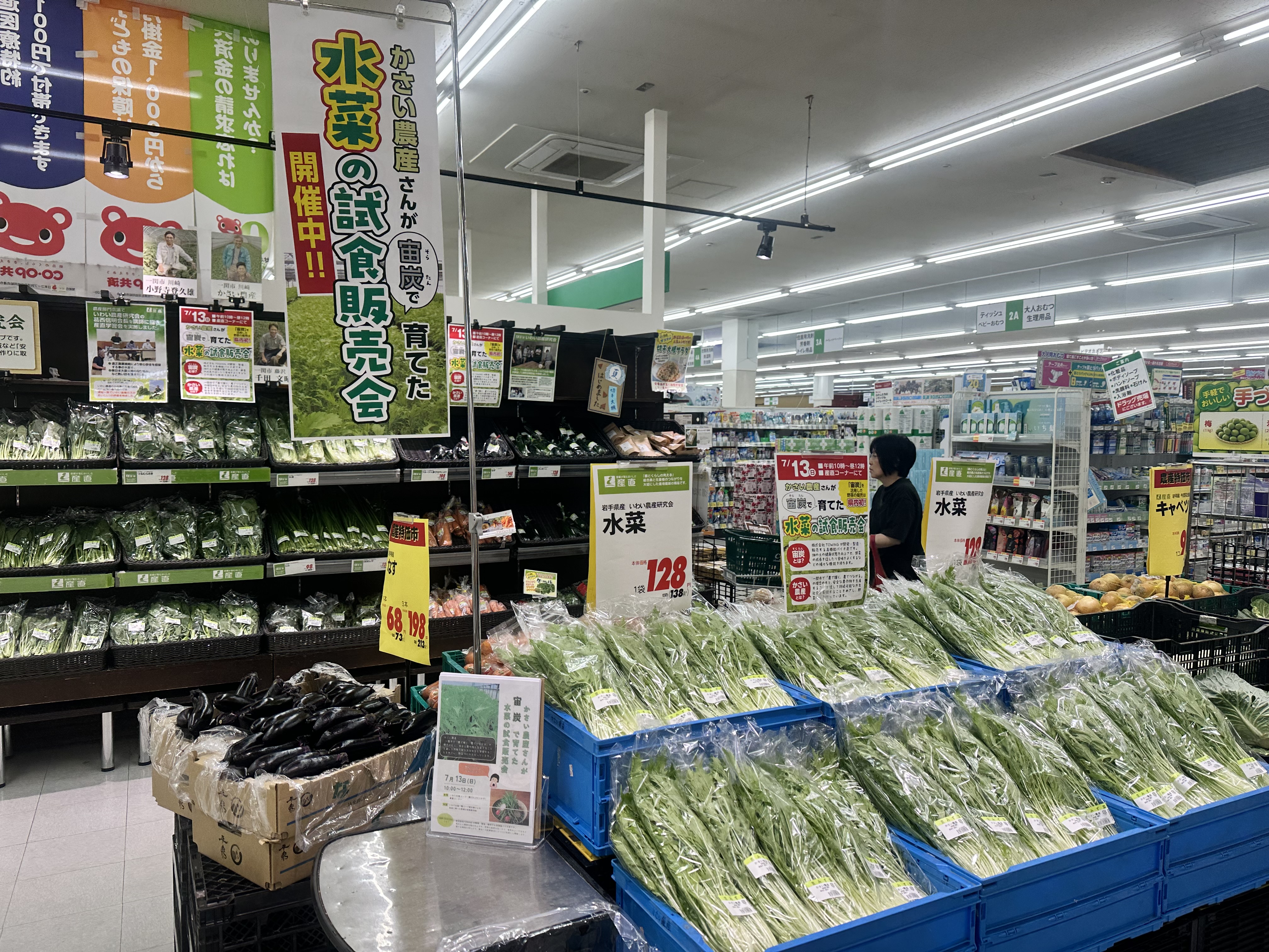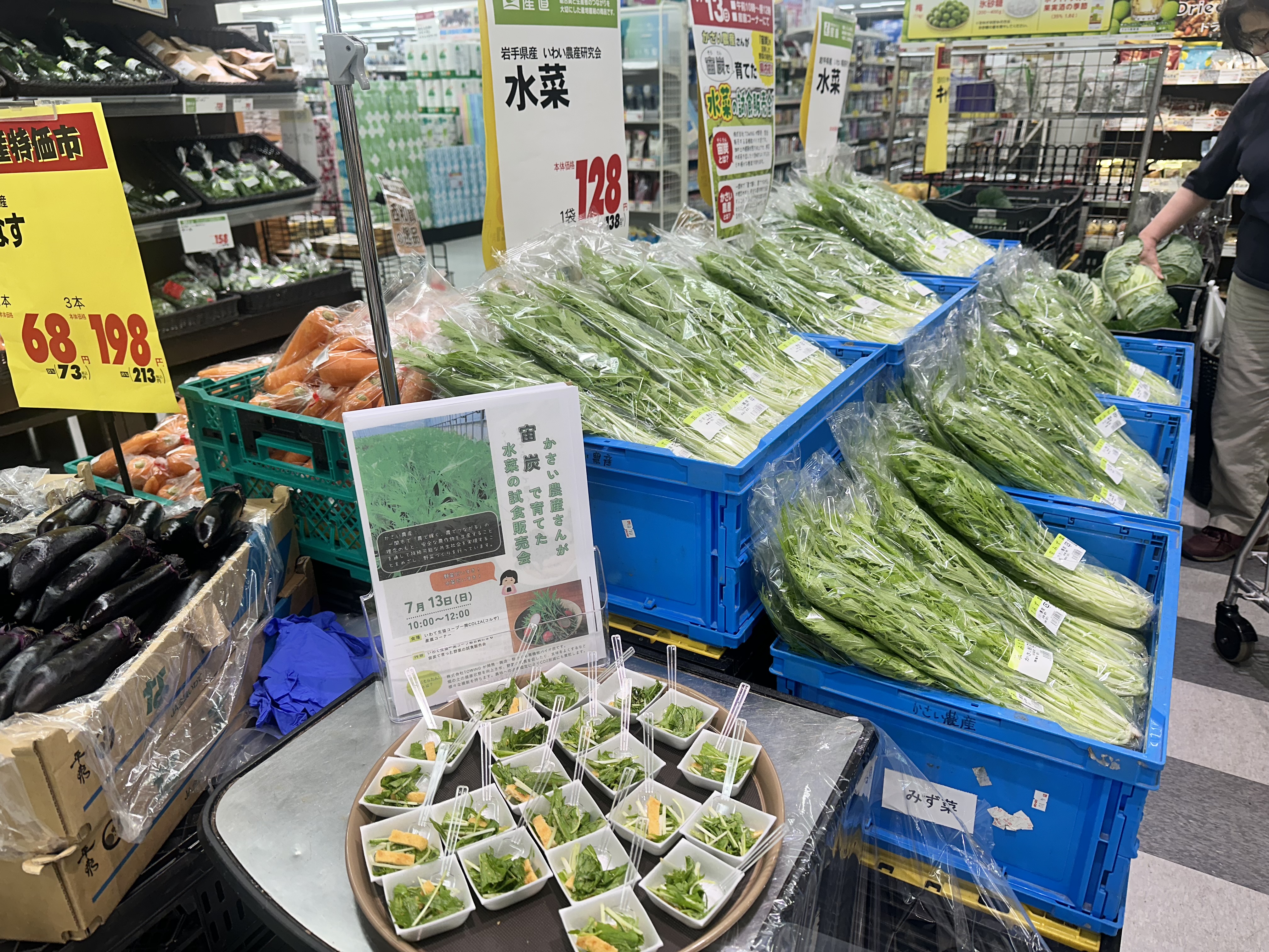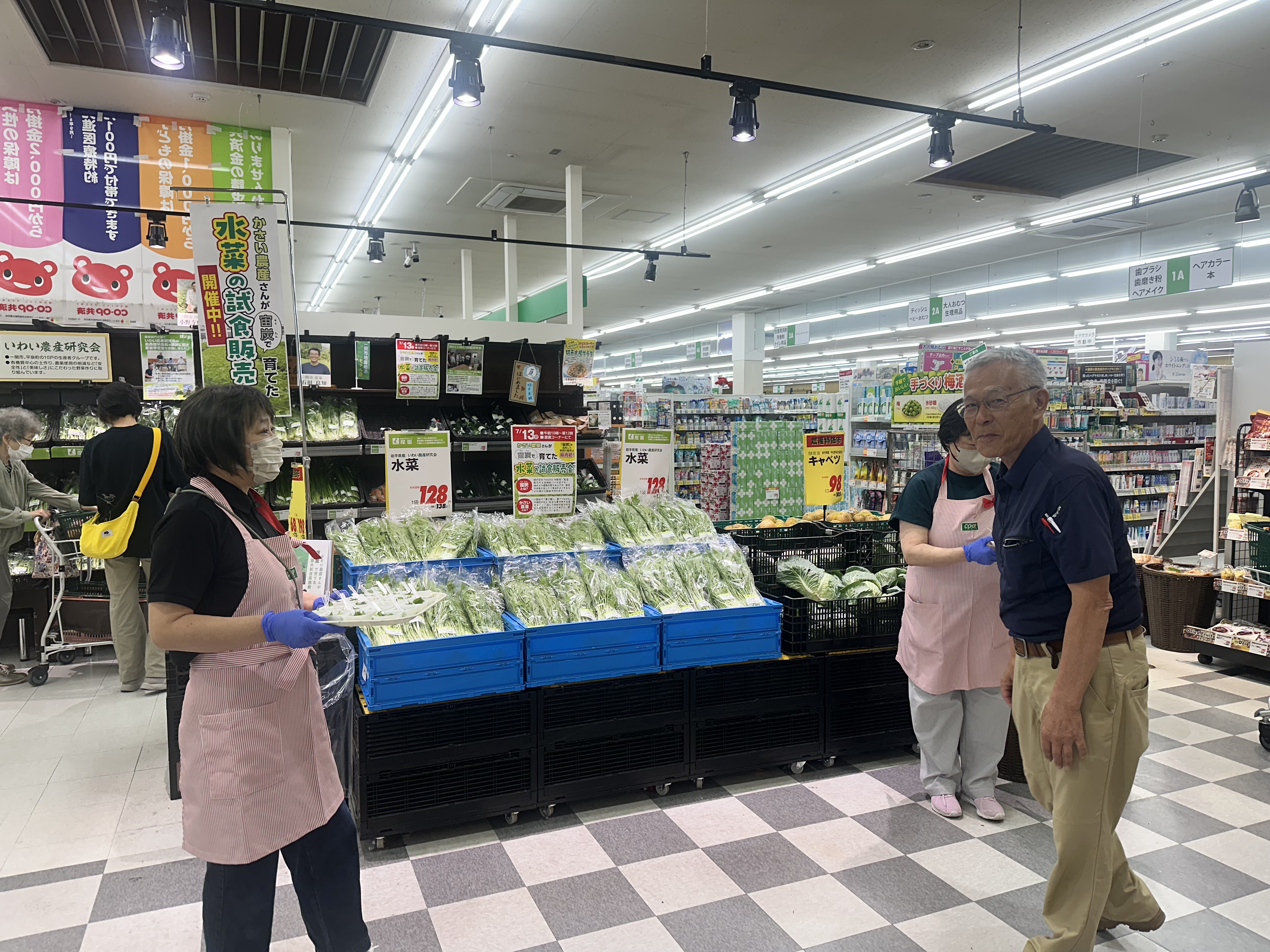 「宙炭(そらたん)」を使った、いわい農産の野菜を試食販売(7月13日 コープ一関コルザ)