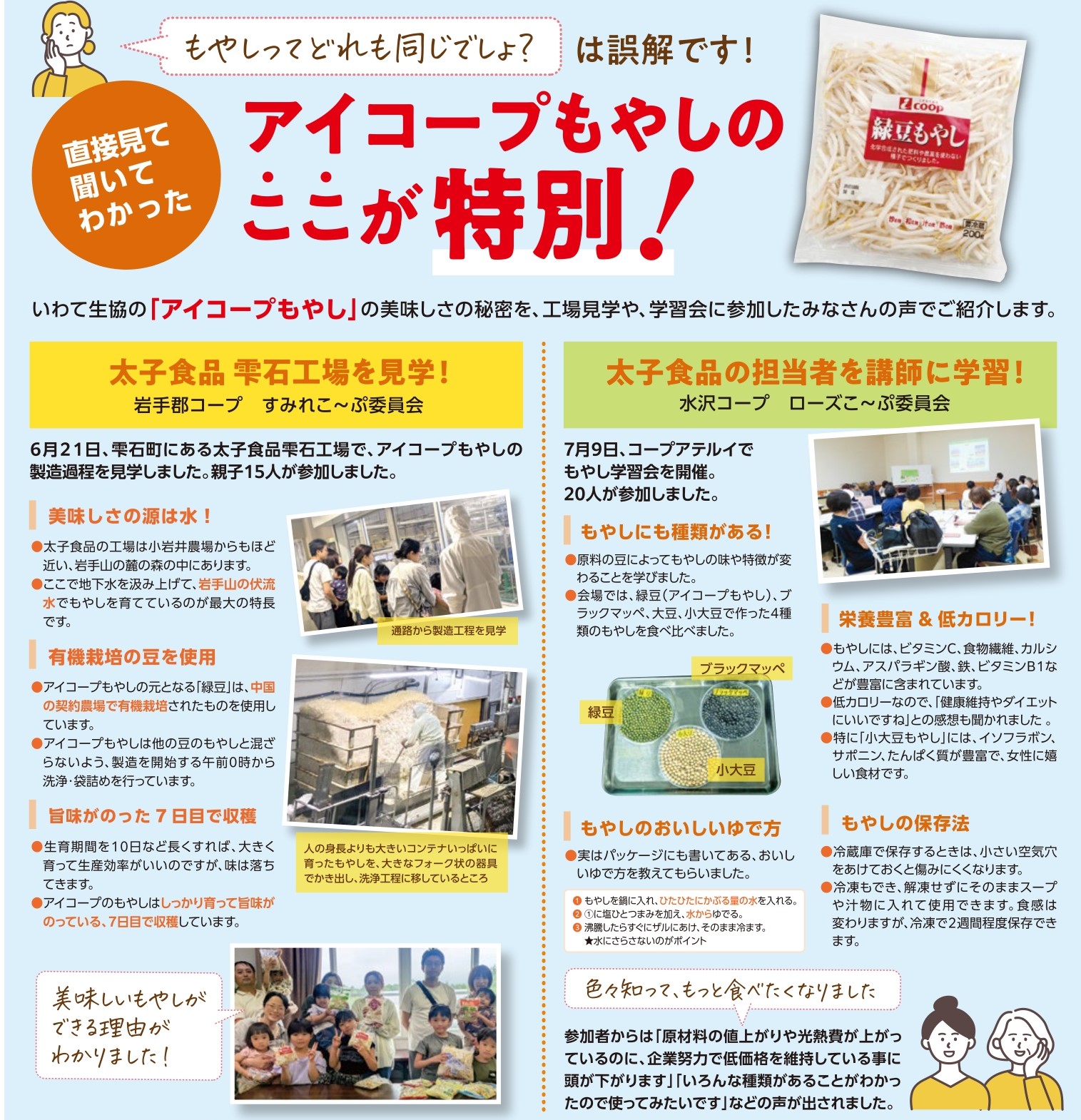 岩手郡コープすみれこ~ぷ委員会では6月に製造者の太子食品雫石工場を見学、水沢コープローズこ~ぷ委員会では7月に太子食品の担当者を講師に商品学習会を行いました。