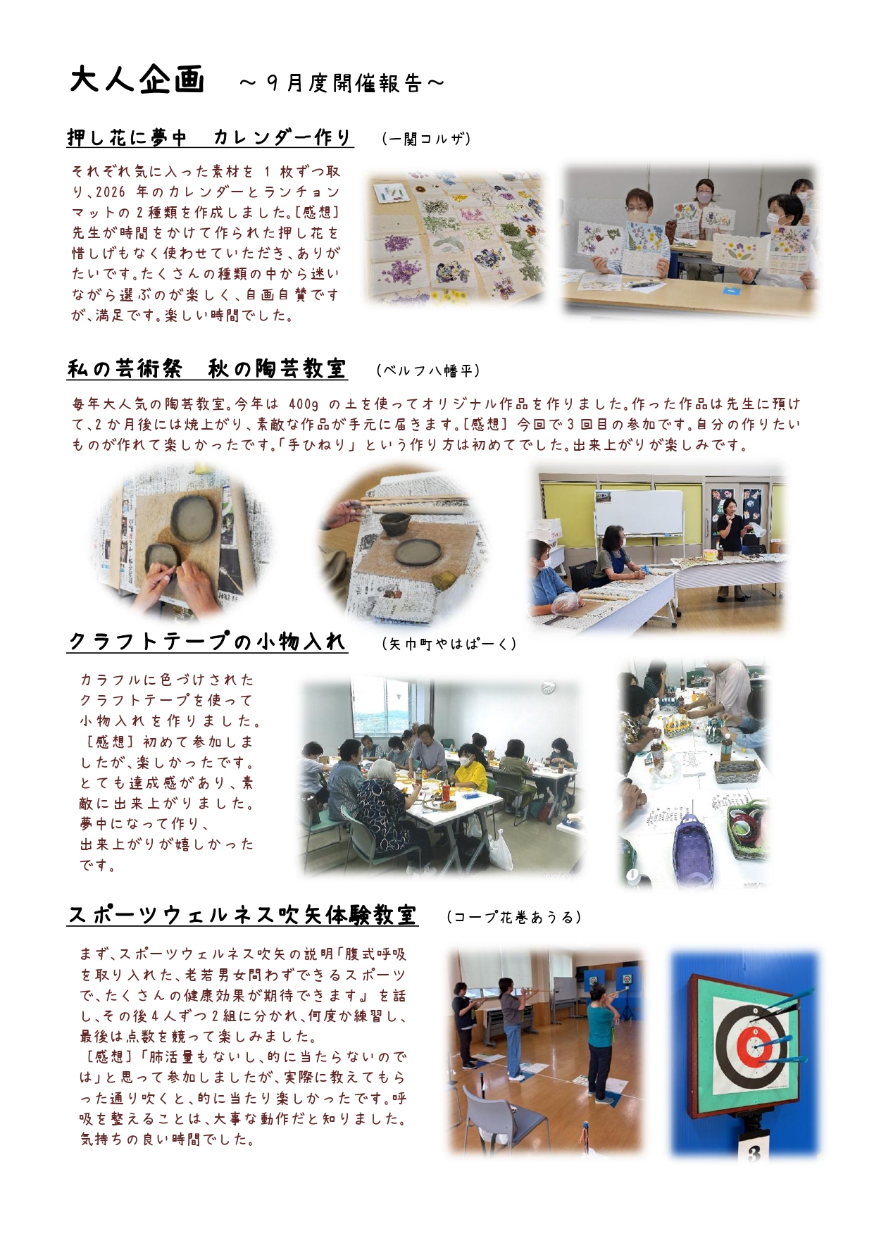 大人企画とは…シニアのいきいきとしたくらし・健康づくりのために、「大人企画」を多彩な内容で、生協の店舗や地域公民館などで開催しています。 9月は県内各地で18企画を行い、186人の参加でした。その一部をご紹介します。