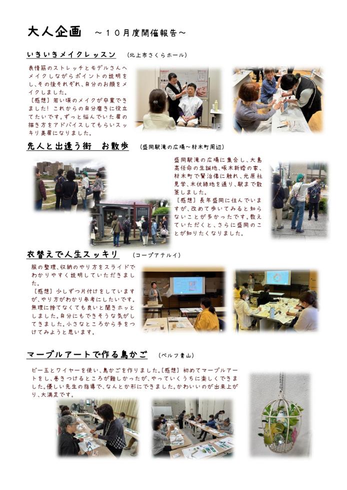 大人企画とは…シニアのいきいきとしたくらし・健康づくりのために、「大人企画」を多彩な内容で、生協の店舗や地域公民館などで開催しています。 10月は県内各地で20企画を行い、177人の参加でした。その一部をご紹介します。