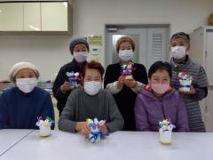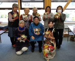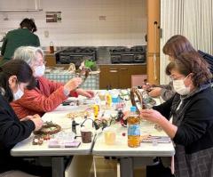 内容: リース型の華やかなしめ縄作りを行いました。好きな色の土台や水引を選び、専用ボンドで花や葉を貼り付け、最後に金の鶴を飾りました。活動後にはお試し商品のスープで交流も深めました。