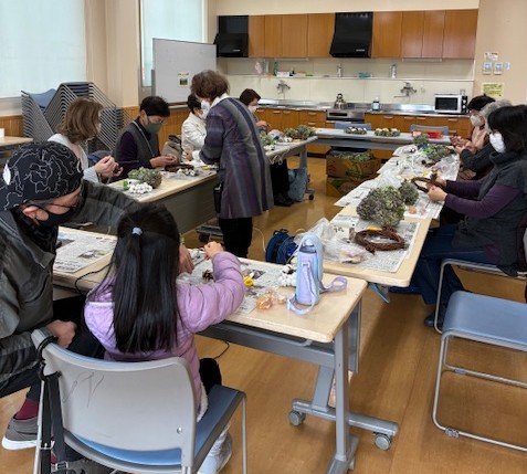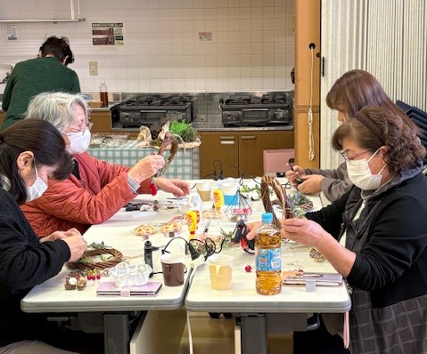 内容: 吉田昌子先生を講師に迎え、アジサイや綿、ドライフラワーをグルーガンで取り付けるリース作りを行いました。講師からドライフラワーの作り方や素材の扱い方のコツを学びながら、和気あいあいとした雰囲気で作業を進めました。