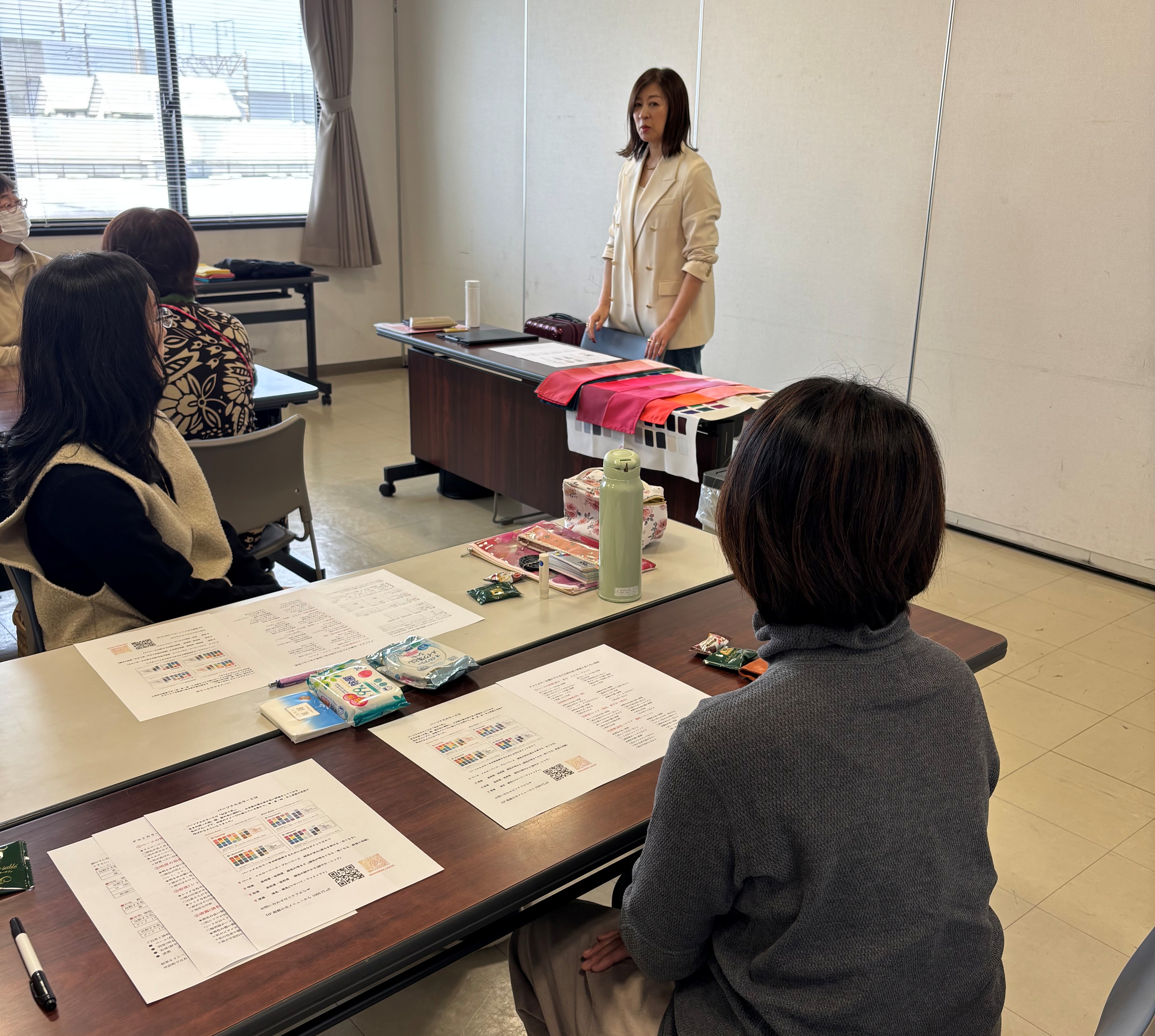 内容: 高橋真澄先生を講師に迎え、自分に似合う色を見つける体験会を行いました。胸元に色画用紙をあてて顔色の見え方を比較し、参加者同士でアドバイスを送り合いながら、自分を引き立てるカラーを探りました。