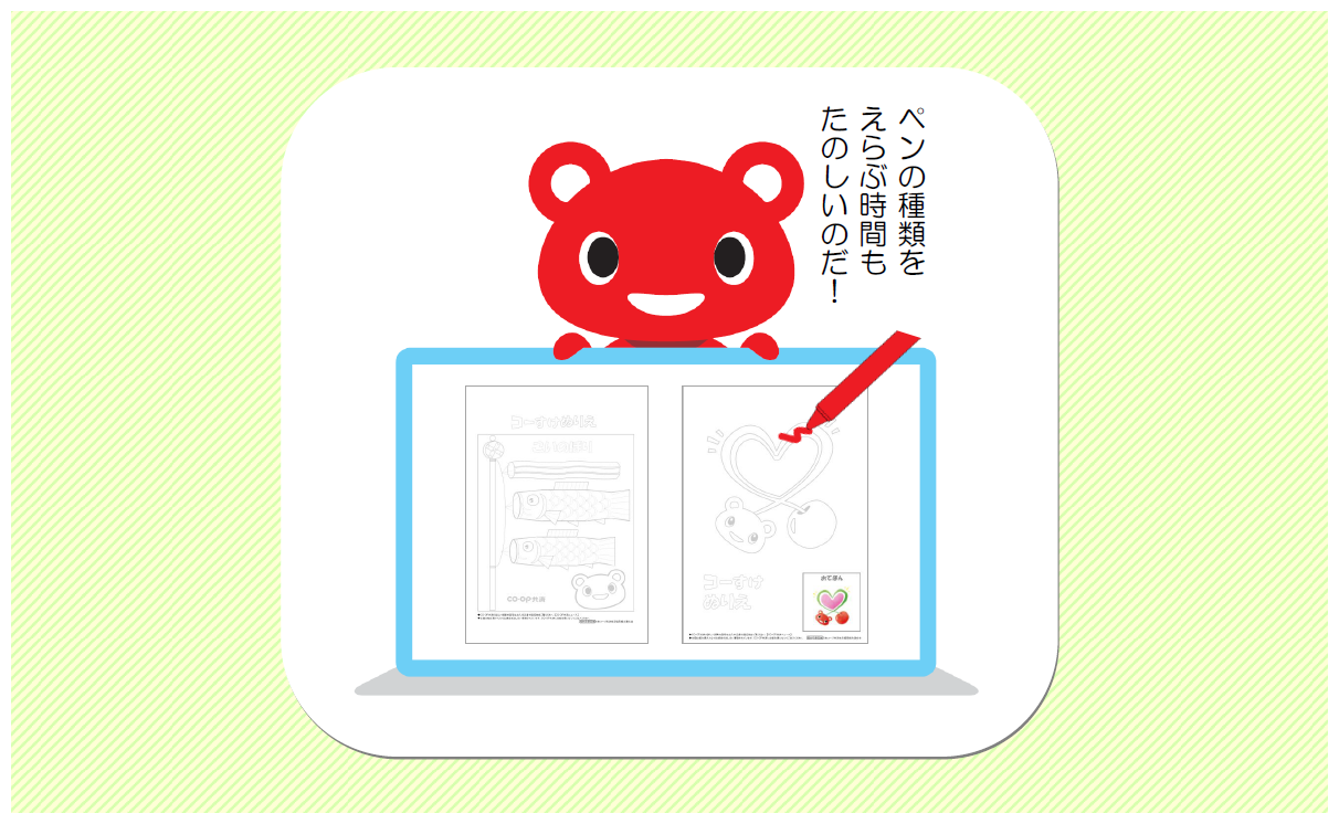 コープ共済キャラクター・コーすけのぬりえシリーズ。 新たに5つのデザインが仲間入り! 木もれ日の下で赤いコーすけに色をぬると よりいっそう元気になれますね♪♪♪