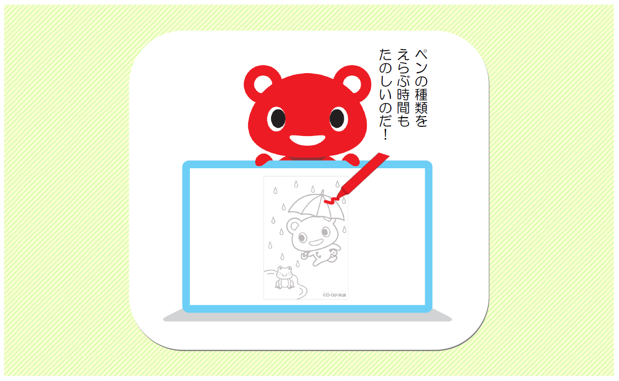 コープ共済キャラクター・コーすけのぬりえシリーズ。 新たに3つのデザインが仲間入り! 雨の日もみんなで コーすけのぬりえをたのしむと 元気になりますね♪♪♪♪♪