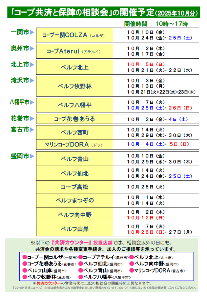 「コープ共済と保障の相談会」開催日程 ~10月のご案内~