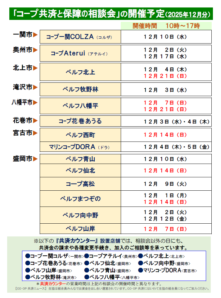 「コープ共済と保障の相談会」開催日程 ~12月のご案内~