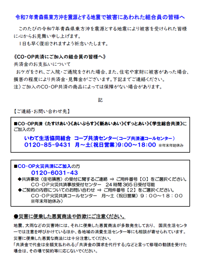 青森県東方沖を震源とする地震で被害を受けた皆様へ◆コープ共済◆