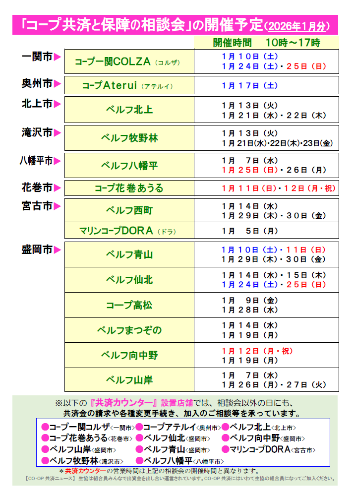 「コープ共済と保障の相談会」開催日程 ~1月のご案内~