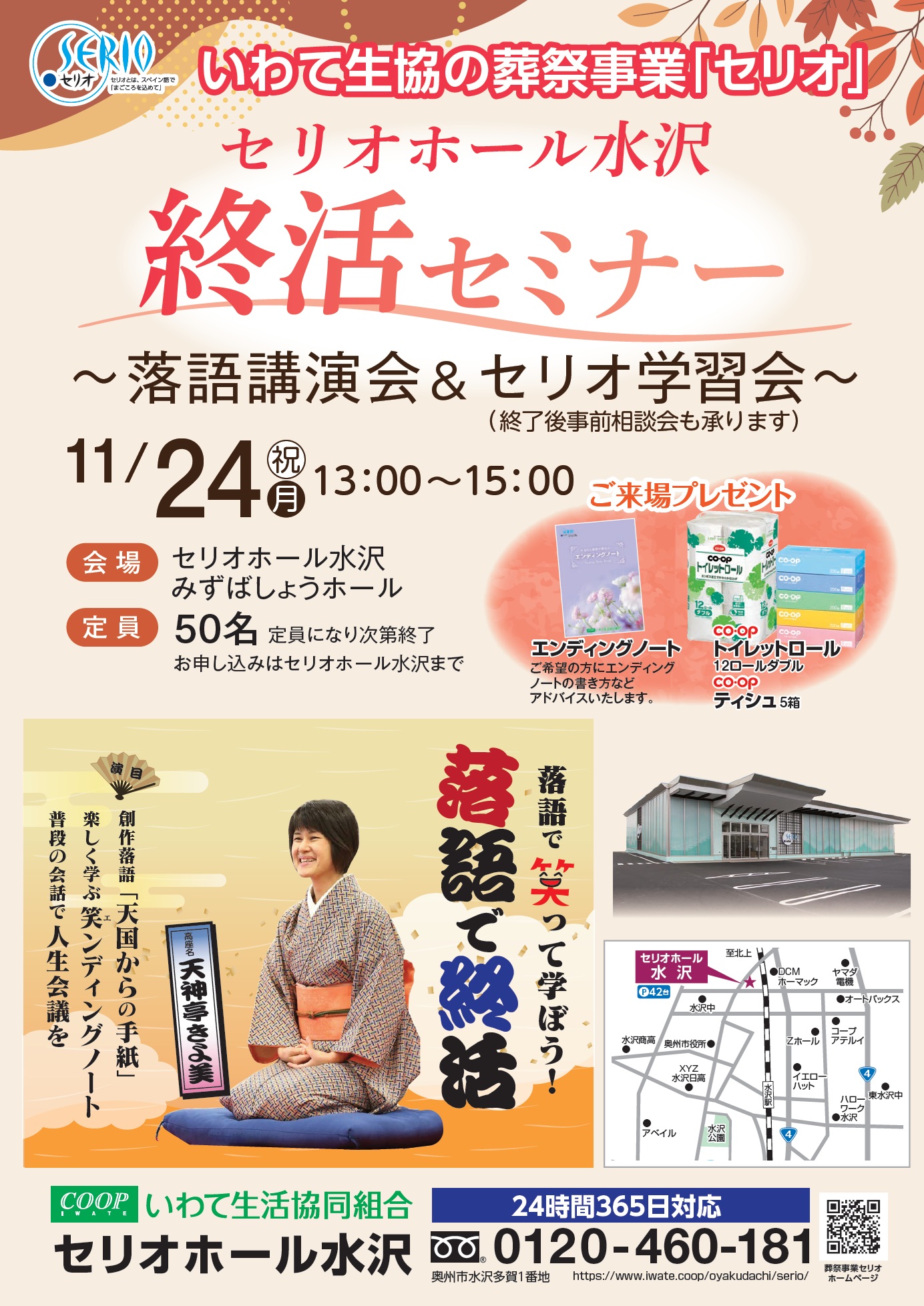 【セリオホール水沢】11月24日(月祝)「終活セミナー~落語講演会&セリオ学習会~」開催します
