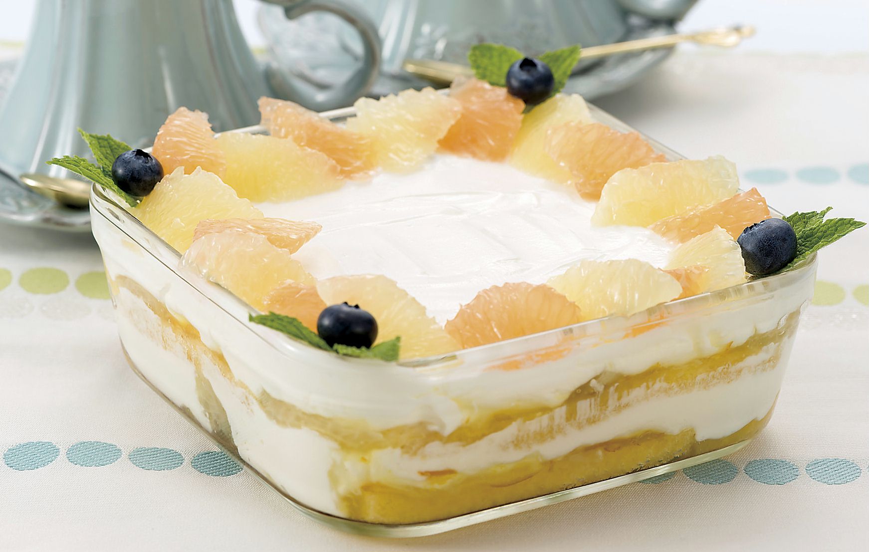 水切りヨーグルト100g、生クリーム100ml、砂糖大さじ2弱、カステラ3cm(厚さ)、オレンジマーマレード大さじ2、グレープフルーツ1/2個、飾り用のグレープフルーツ・ミントなど適宜
