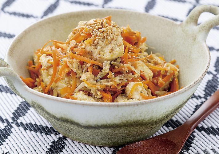 もめん豆腐1丁、人参小1本、しらす干し20g、めんつゆ大さじ2、白ごま少々、サラダ油適量