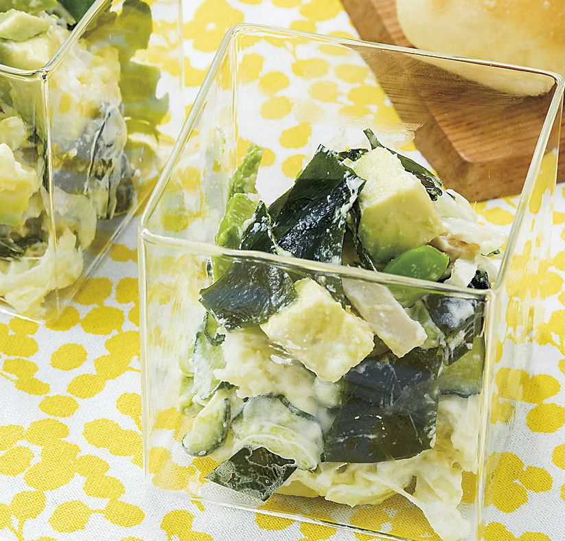 塩蔵わかめ30g、じゃが芋3個、アボカド1個、玉ねぎ1/2個、ハム3枚、きゅうり1本、枝豆(冷凍)50g、マヨネーズ大さじ6、チューブ入りわさび小さじ2、塩・こしょう・レモン汁各適量