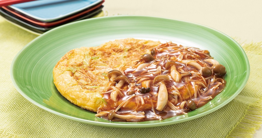 3)フライパンに再びサラダ油を熱し、きのこを炒める。酢豚の素を加え温めたら2)をかける。