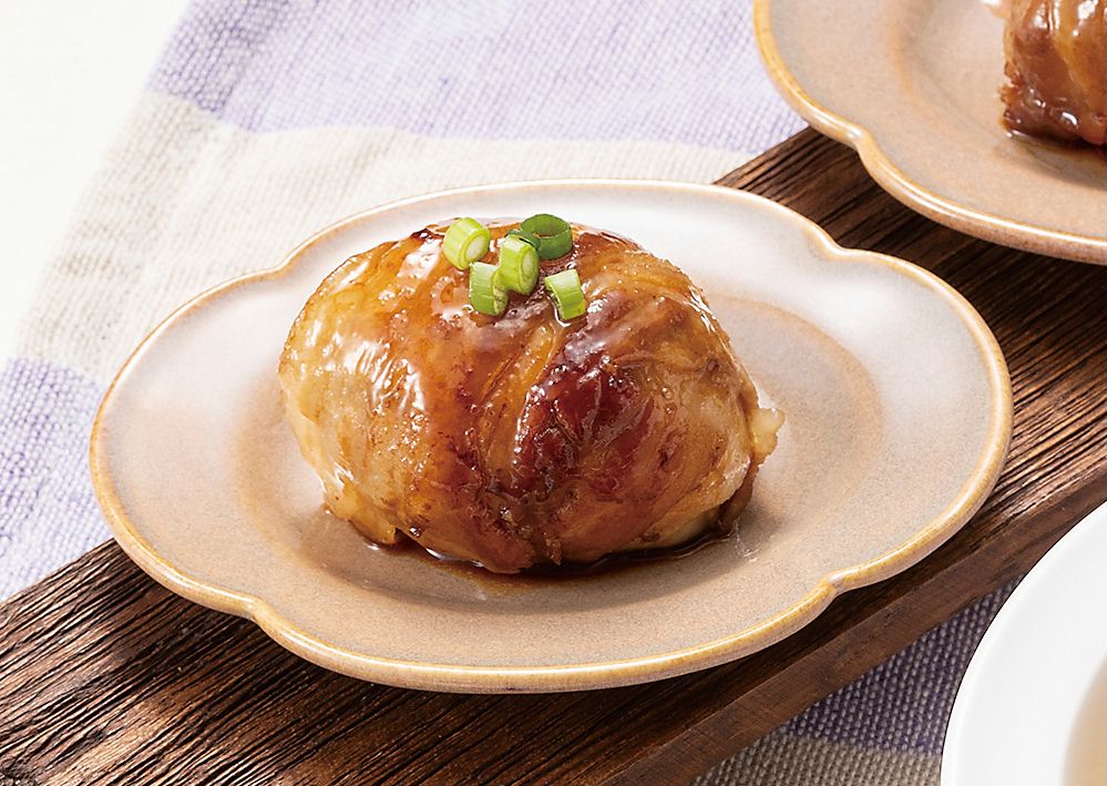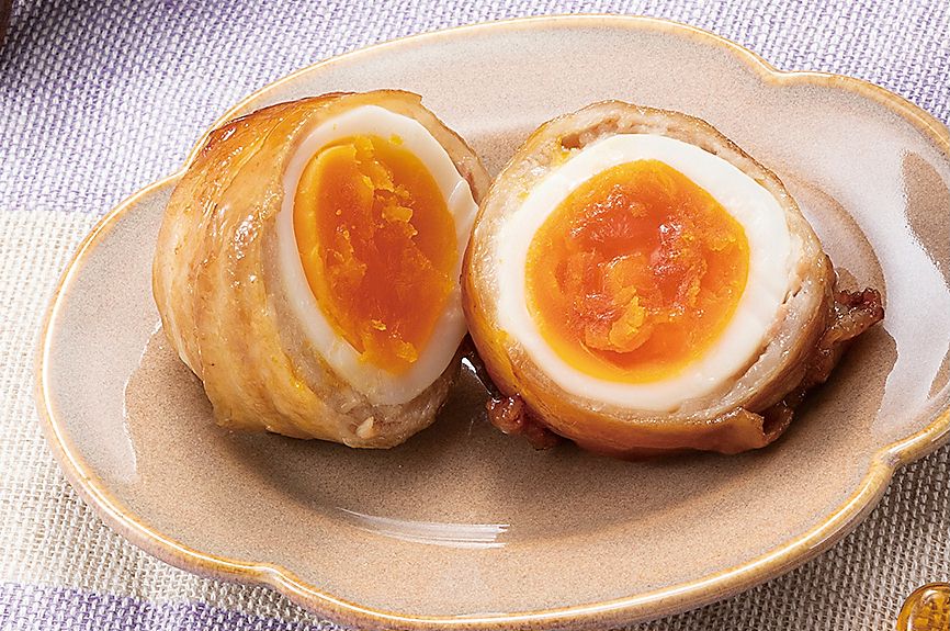 2)豚バラ肉2枚でゆで卵1個を巻く。1枚目は縦に、2枚目は横に少しずつずらしながら巻き、ゆで卵の表面を覆う。巻き終わりに小麦粉をつける。
