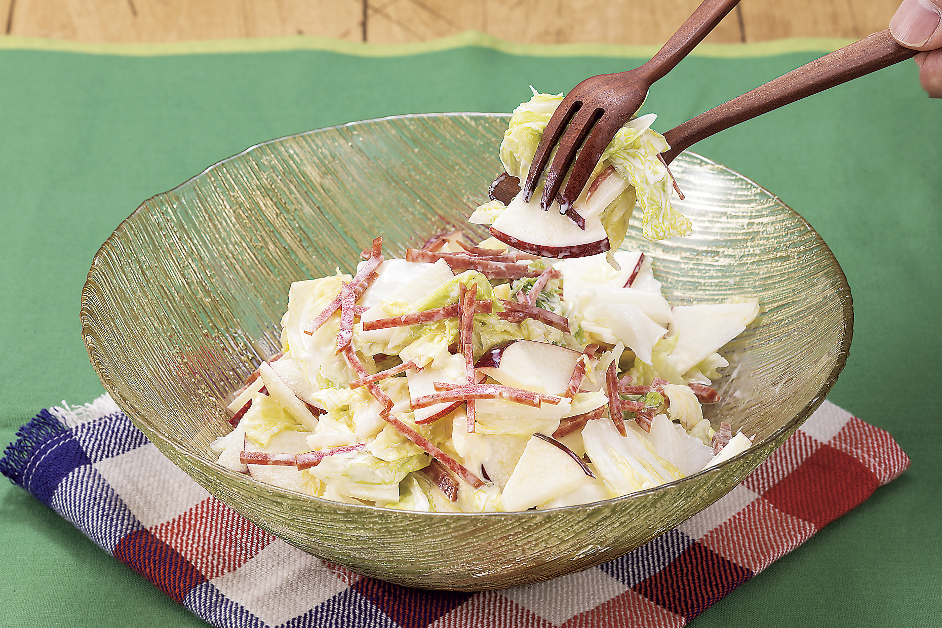 りんご1/4個、白菜1/8個、サラミ40g、塩2つまみ、マヨネーズ大さじ3