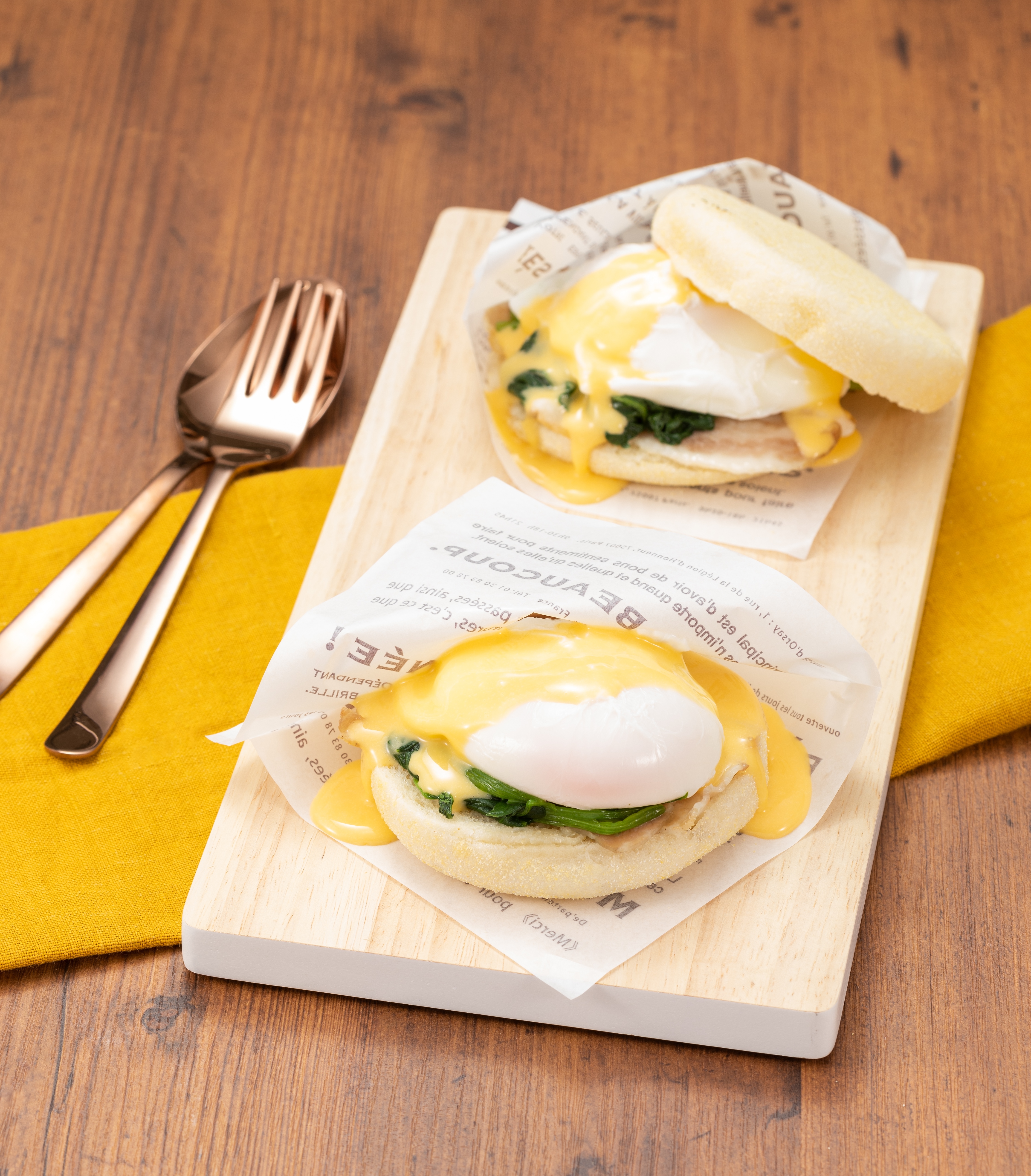 5) 下側のマフィンにベーコン、2)3)の順にのせ、1)をかけ、上側のマフィンを添える。