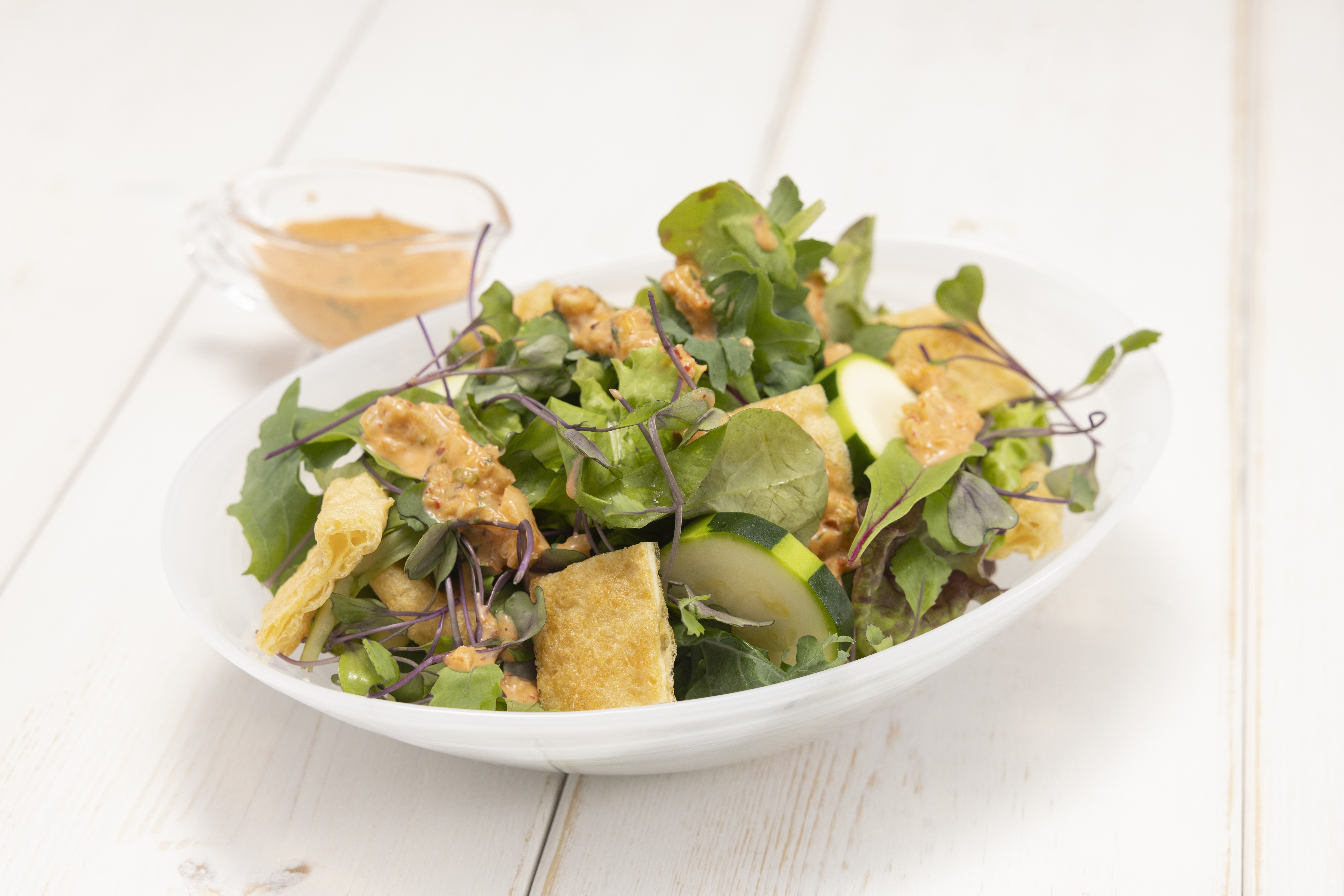3)器にベビーリーフ、ズッキーニ、1)を盛り付け、2)をかける。