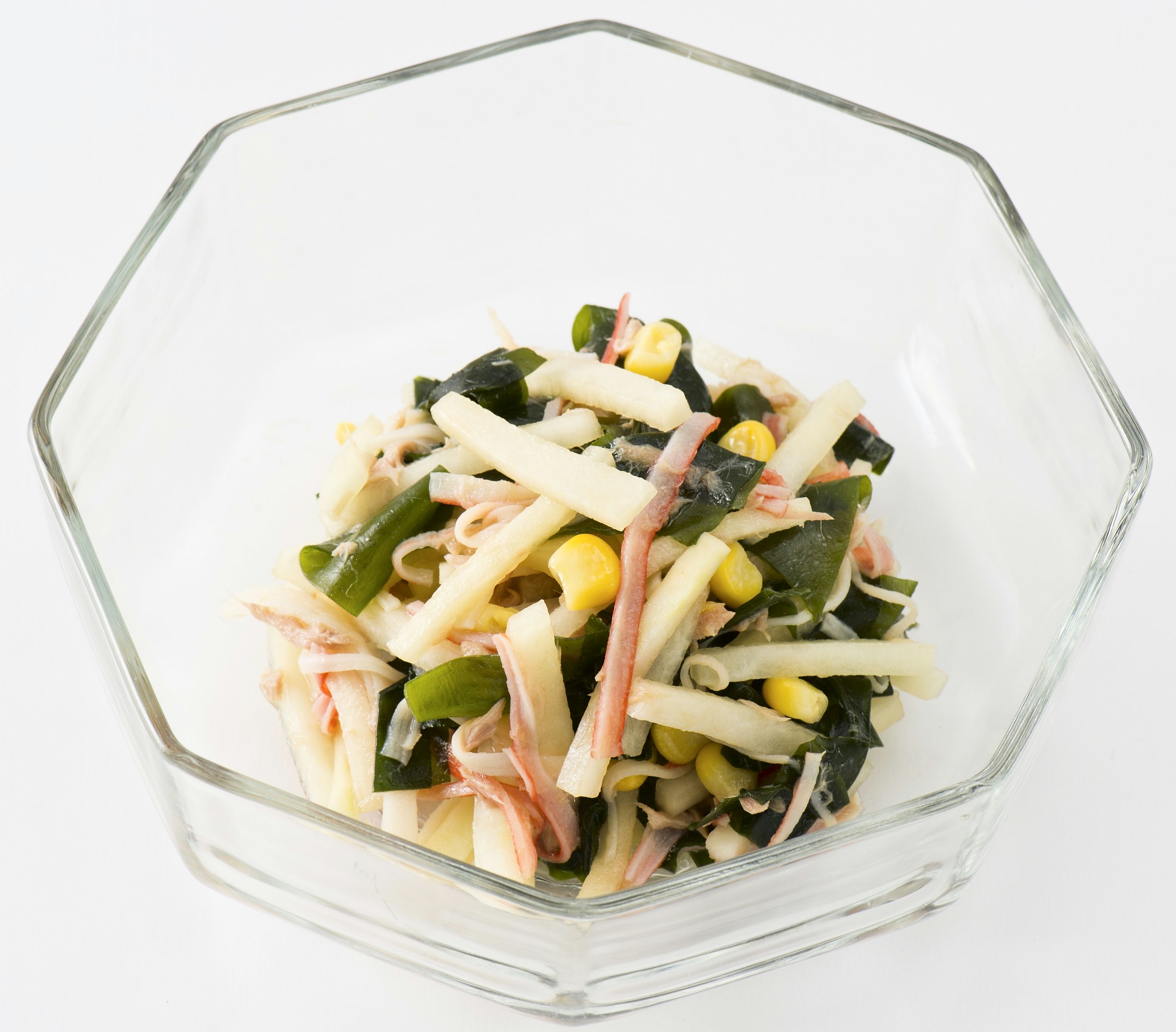戻したわかめ30g、大根150g、ツナ缶(小)1/2缶、かに風味かまぼこ4本(30g)、冷凍コーン大さじ2、コープ青じそドレッシング適量