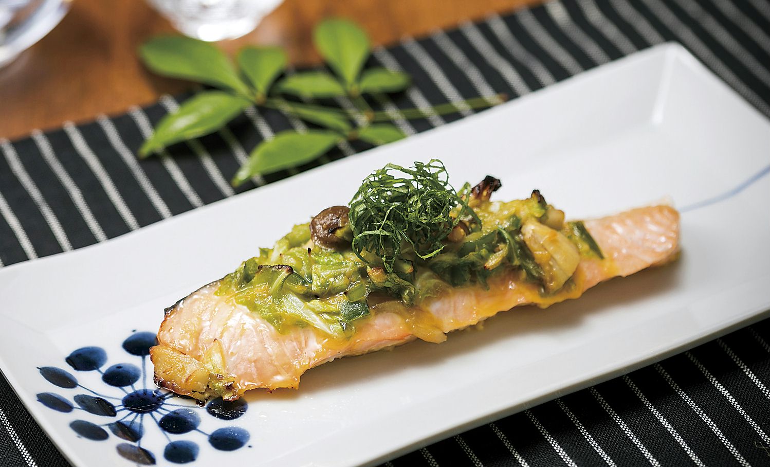4)鮭の上に3)の野菜みそをのせ、グリルまたはオーブンで軽く焦げ目がつくまで焼いてできあがり。