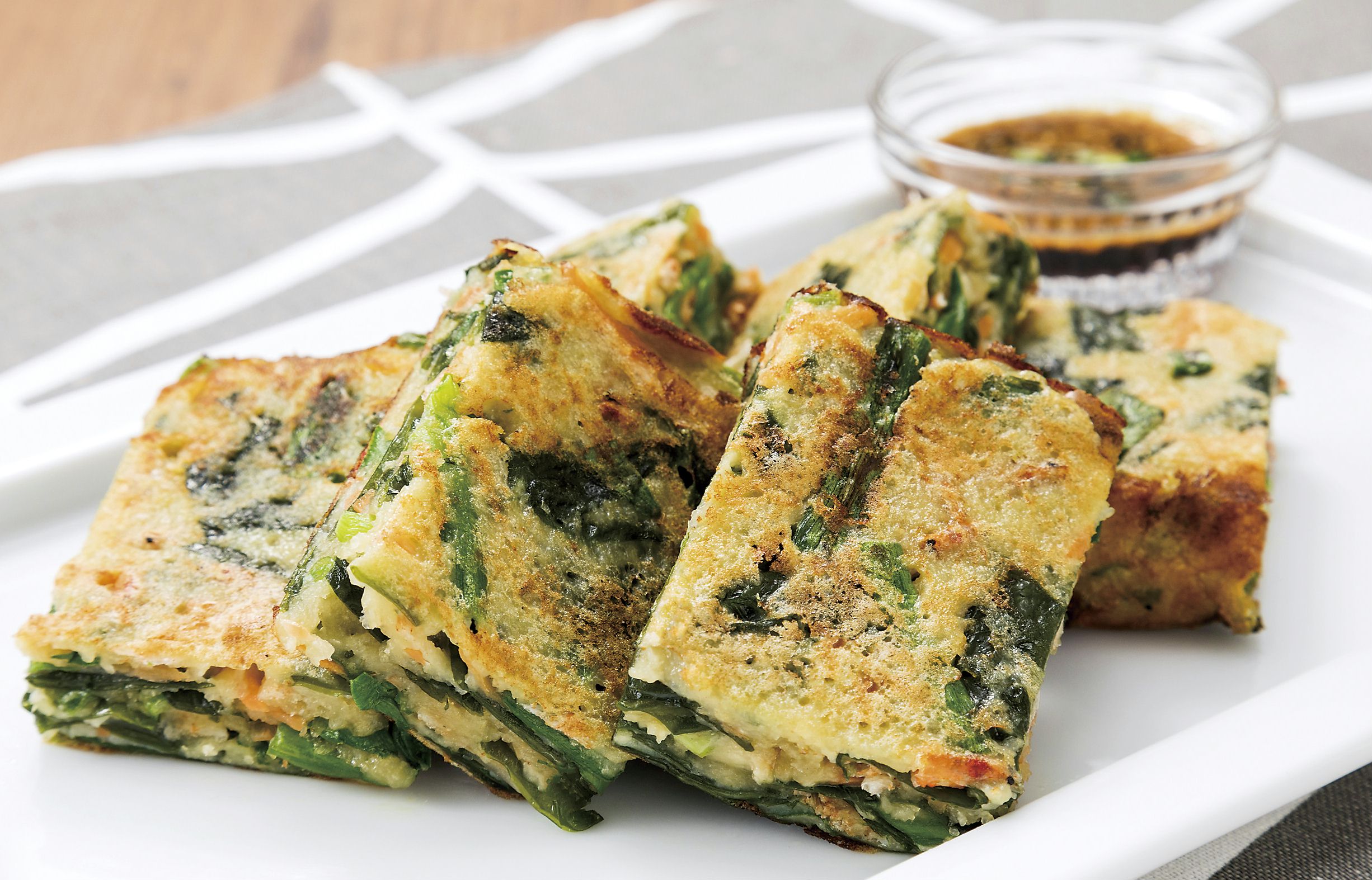 3)フライパンを熱して多めにごま油をひき、2)を半量ずつ焼き、食べやすい大きさに切る。