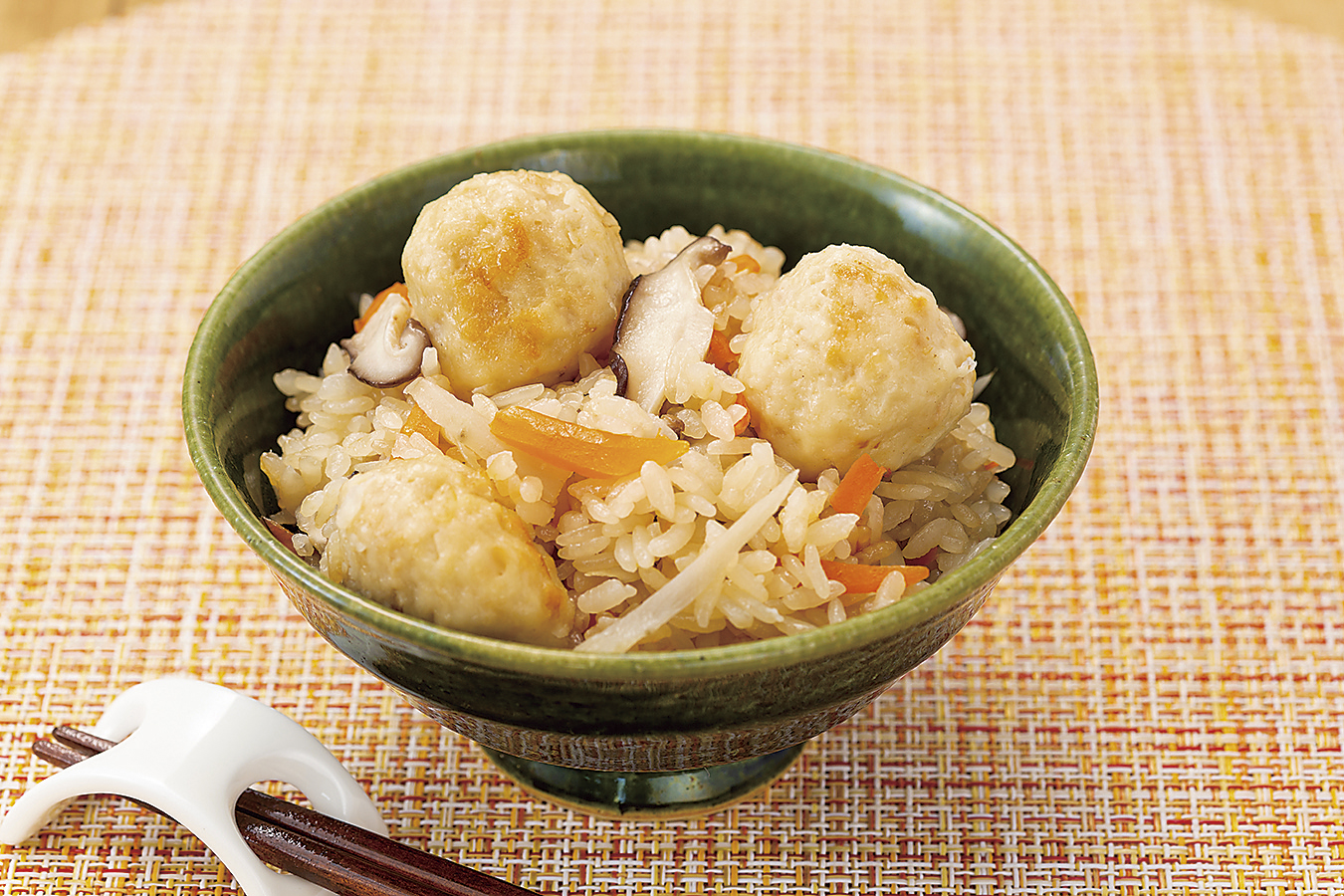 アイコープ産直若鶏肉だんご12個、米2合、ごぼう・にんじん各40g、椎茸2枚、A(アイコープだしたっぷりつゆ40cc、酒30cc)、水適量
