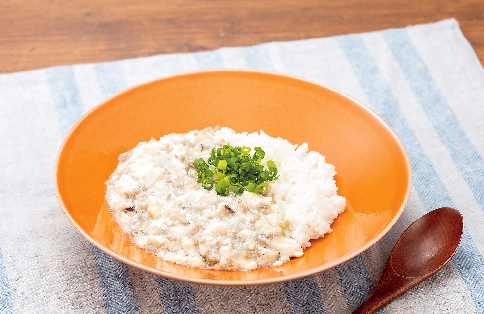 ごはん2膳分、県産大豆きぬごし豆腐150g、豚挽肉80g、玉ねぎ(みじん切り)1/8個分、干し椎茸1枚、片栗粉・水 各小さじ1、ごま油・青ネギ少々、