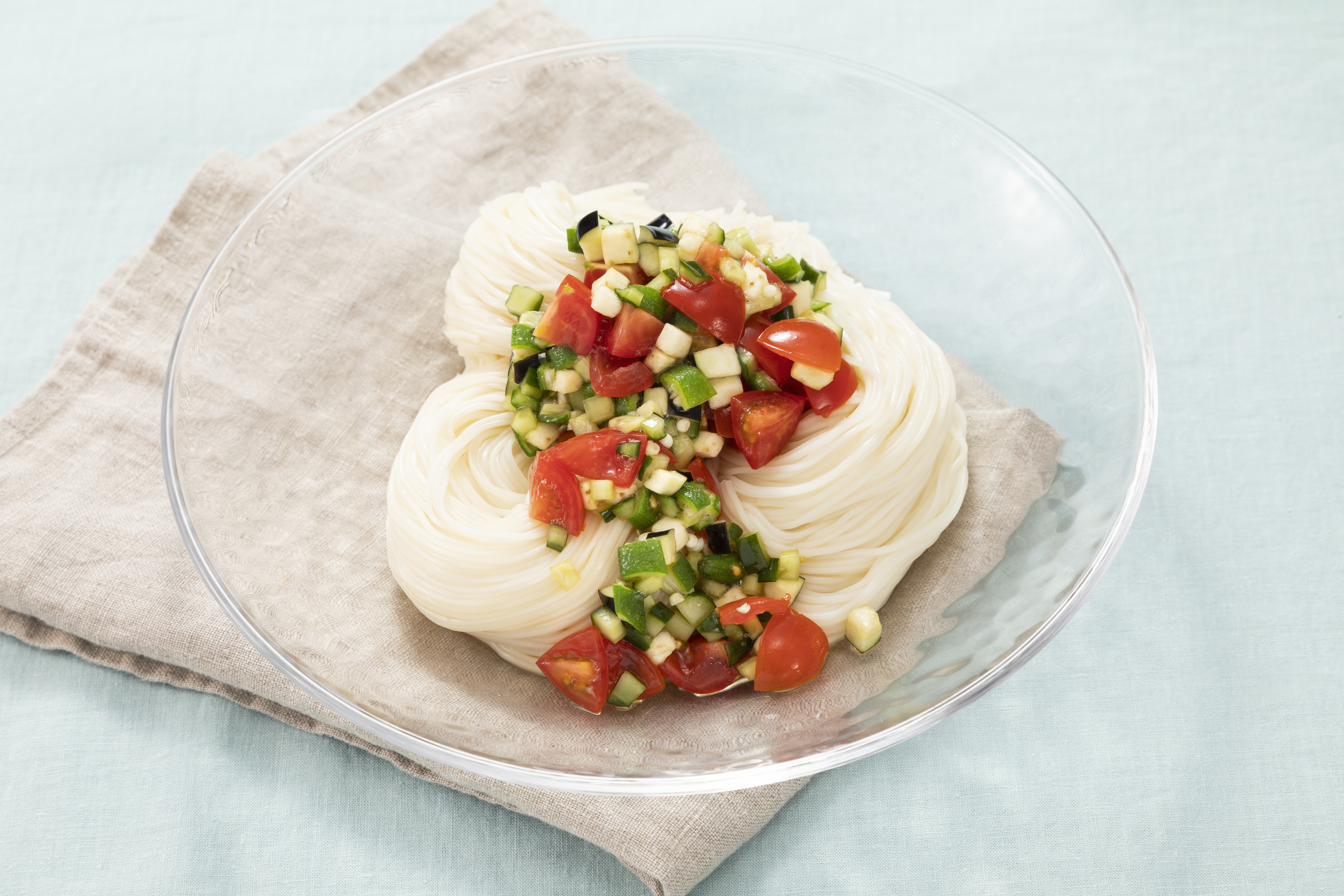 1) そうめんは茹でてザルに上げ、水を切って冷まし、器に盛る。