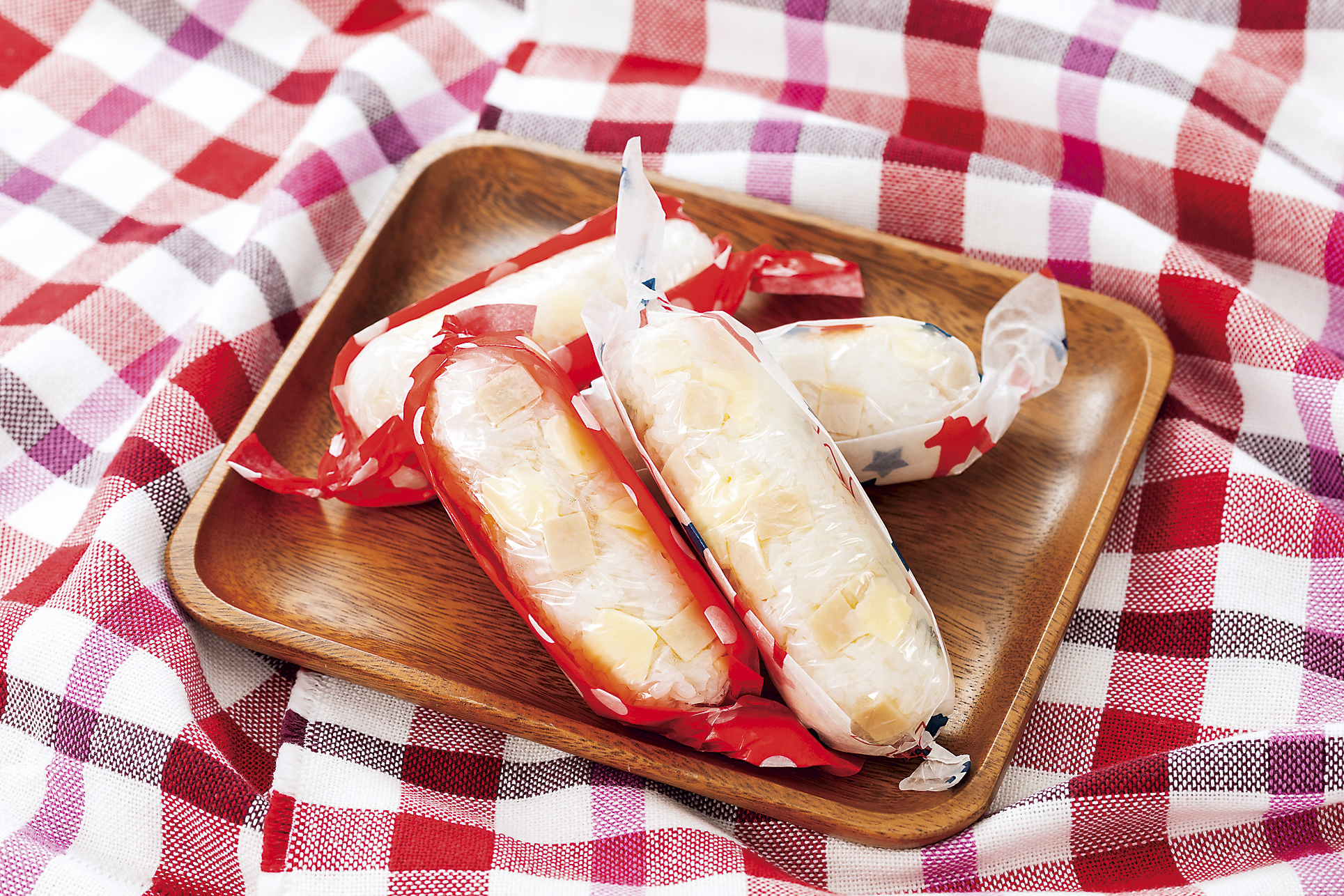 4)ラップを広げ3)の半分をのせ、長さ約15㎝のスティック状に形づくり、しっかり巻く。これを2本作る。