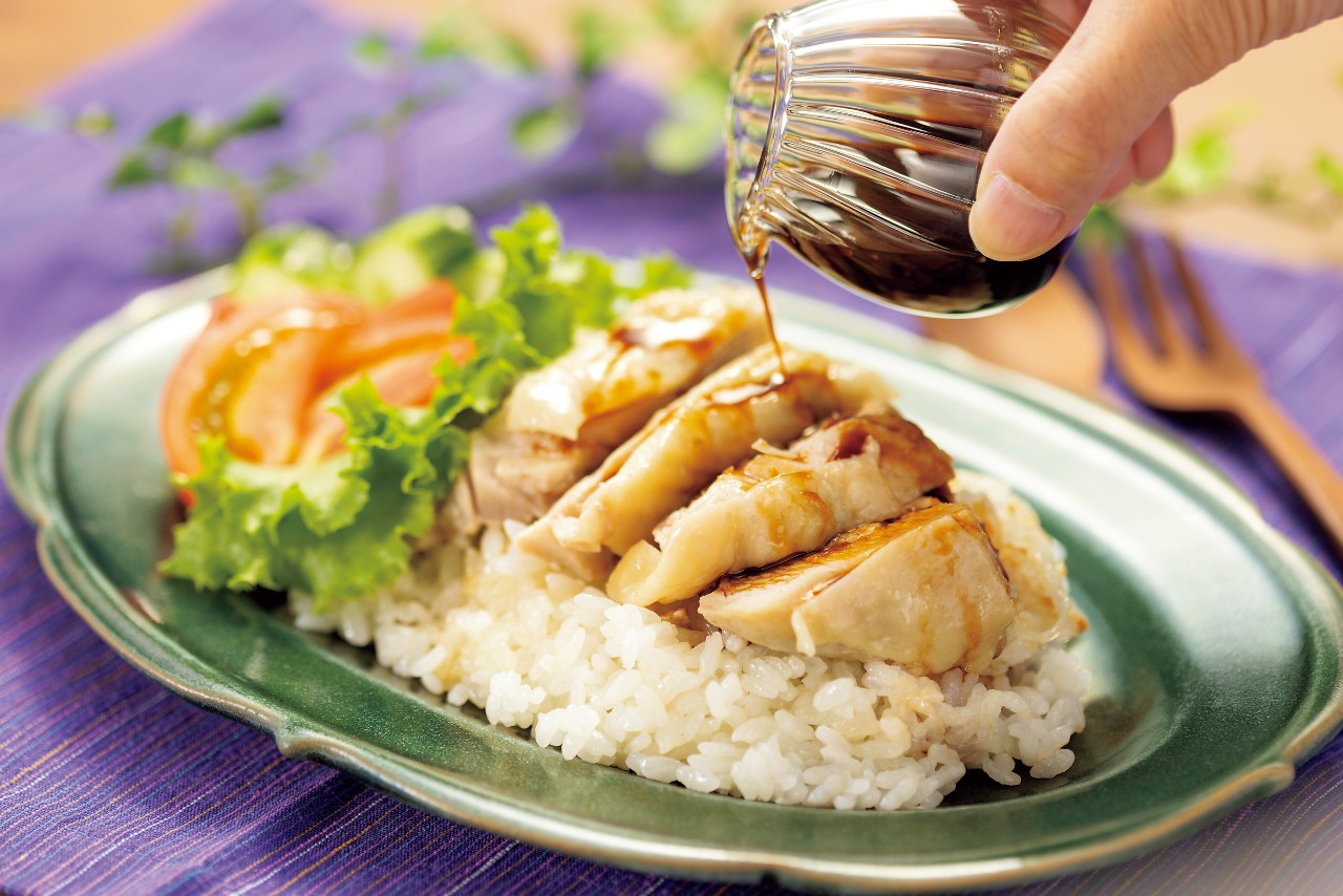 4)鶏もも肉を取り出して適当な厚さに切る。ご飯は大きく混ぜる。器にご飯、鶏もも肉、野菜を盛り付け、Dを混ぜてかける。