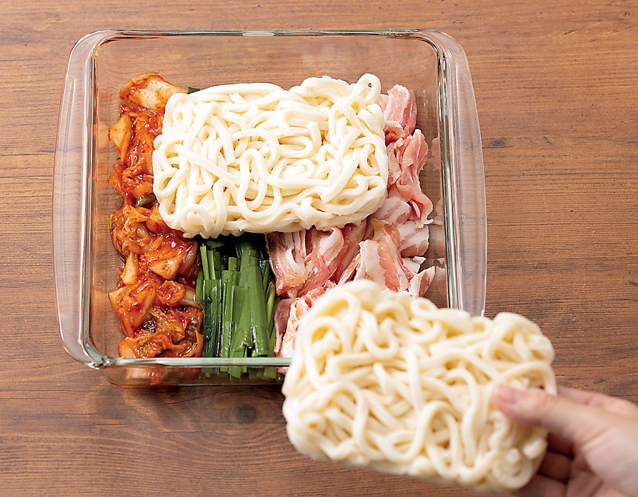 2)耐熱容器に豚肉、にら、キムチを縦3列にしき、Aをまわしかける。