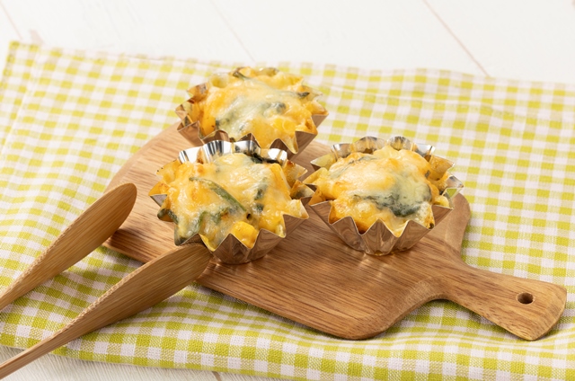 4)アルミカップに等分に入れ、ピザ用チーズをのせたらオーブントースターで焦げ目がつくまで焼く。