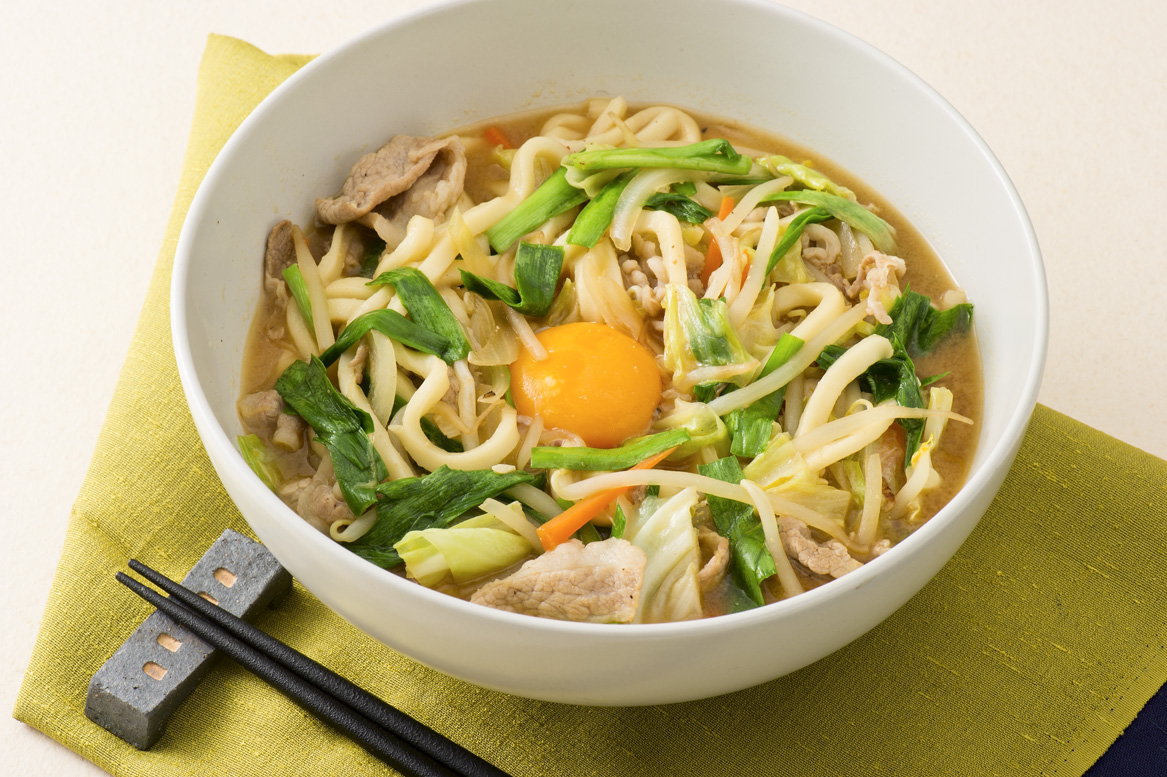 うどん2玉、豚こま切れ100g、キャベツ100g、もやし100g、玉ねぎ1/4個、にら1/4束、人参20g、ごま油少々、にんにく1かけ、塩・こしょう各少々、アイコープみそラーメンスープ2袋、湯600㏄、卵2個、好みで食べるラー油・おろし生姜各適量