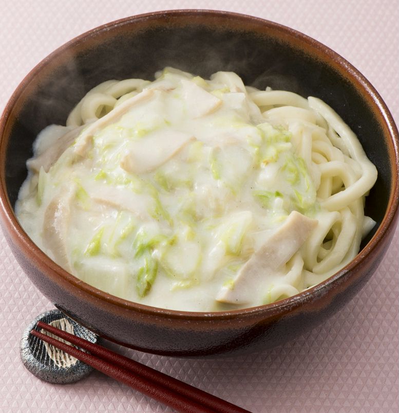 うどん2玉、生協牛乳200ml、白菜100g、ハム60g、長ねぎ1/5本、生姜10g、水200㏄、コープ鶏がらスープ小さじ1、片栗粉大さじ1、ごま油・塩・こしょう各適量