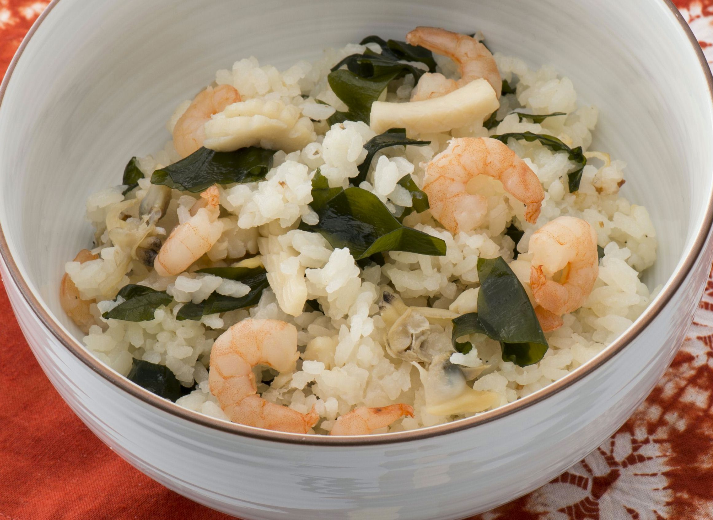 ●材料/4人分 米2カップ、シーフードミックス230g、牛乳150ml、スープ(顆粒コンソメ小さじ1を水50ccで溶いたもの)、わかめ(湯通し塩蔵)・塩・こしょう各適量