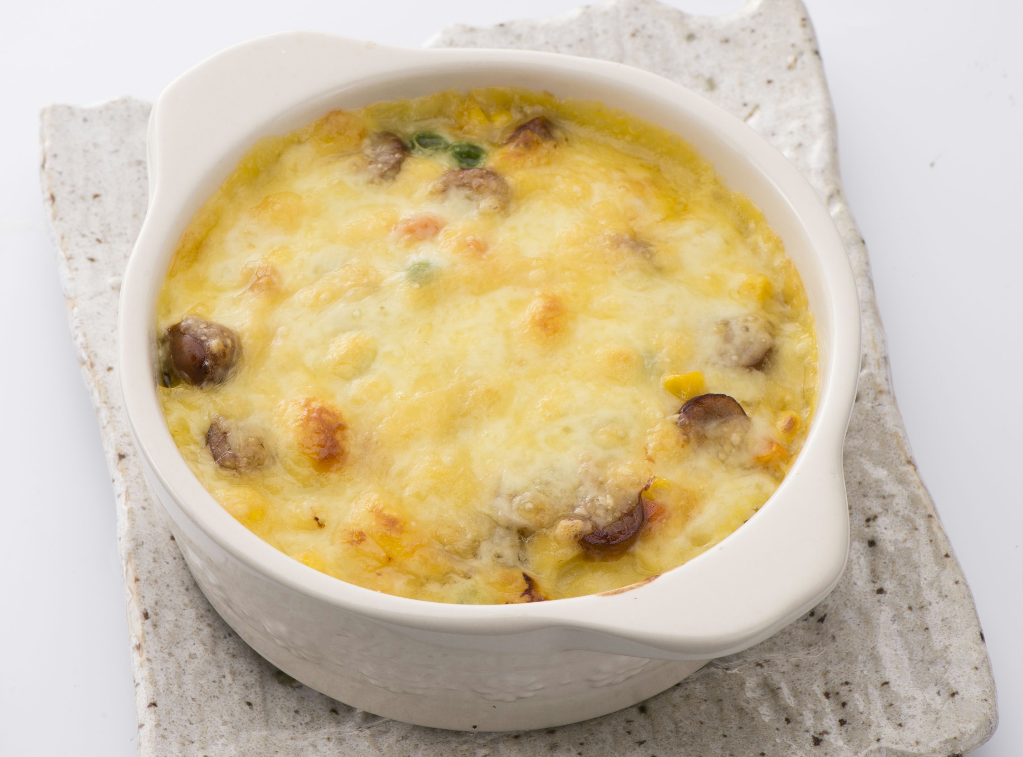 2)耐熱皿にご飯を盛り、①を流し入れ、チーズをのせる。