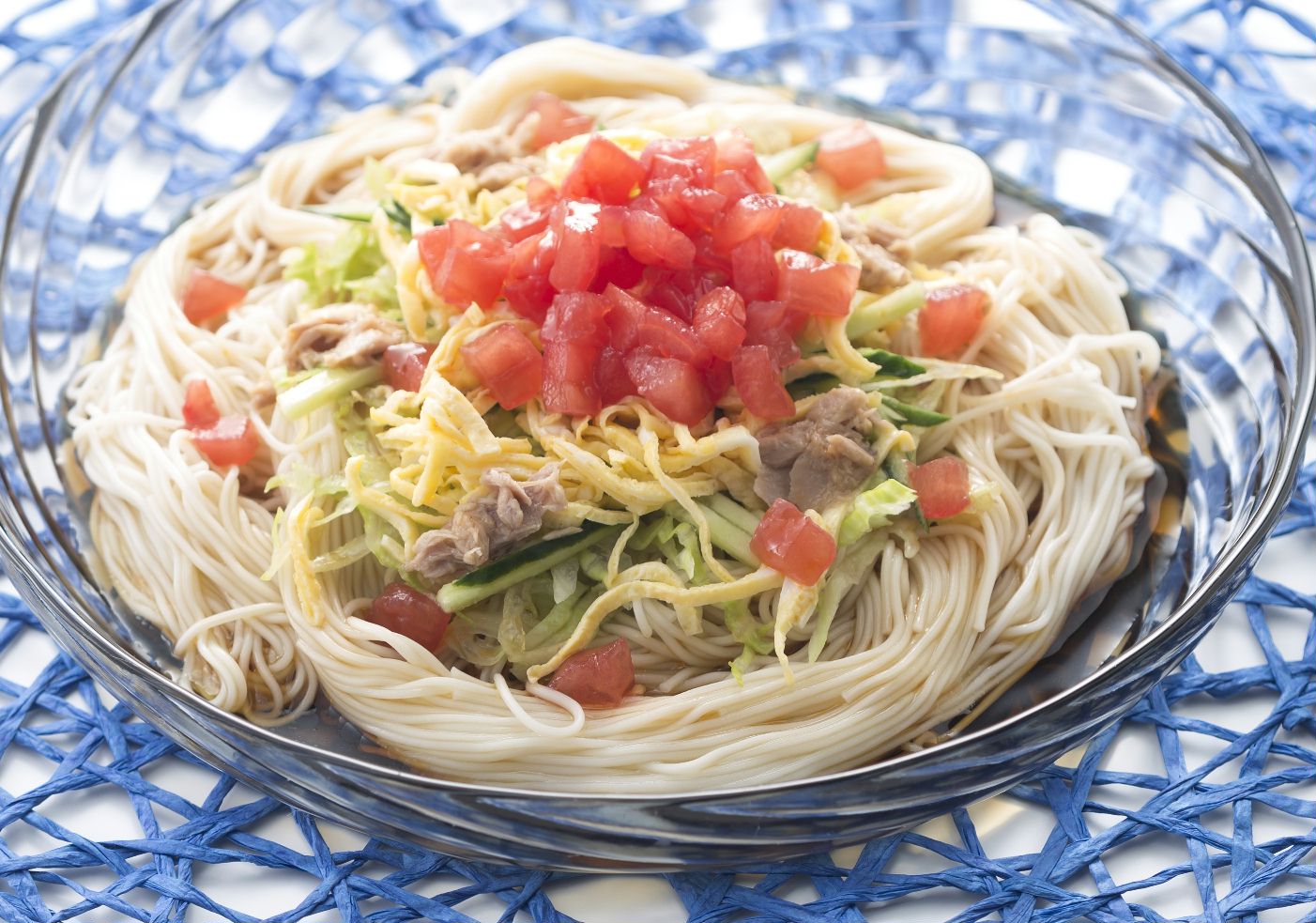 1)そうめんをゆでたら冷水で洗ってザルに上げ、水気を切っておく。