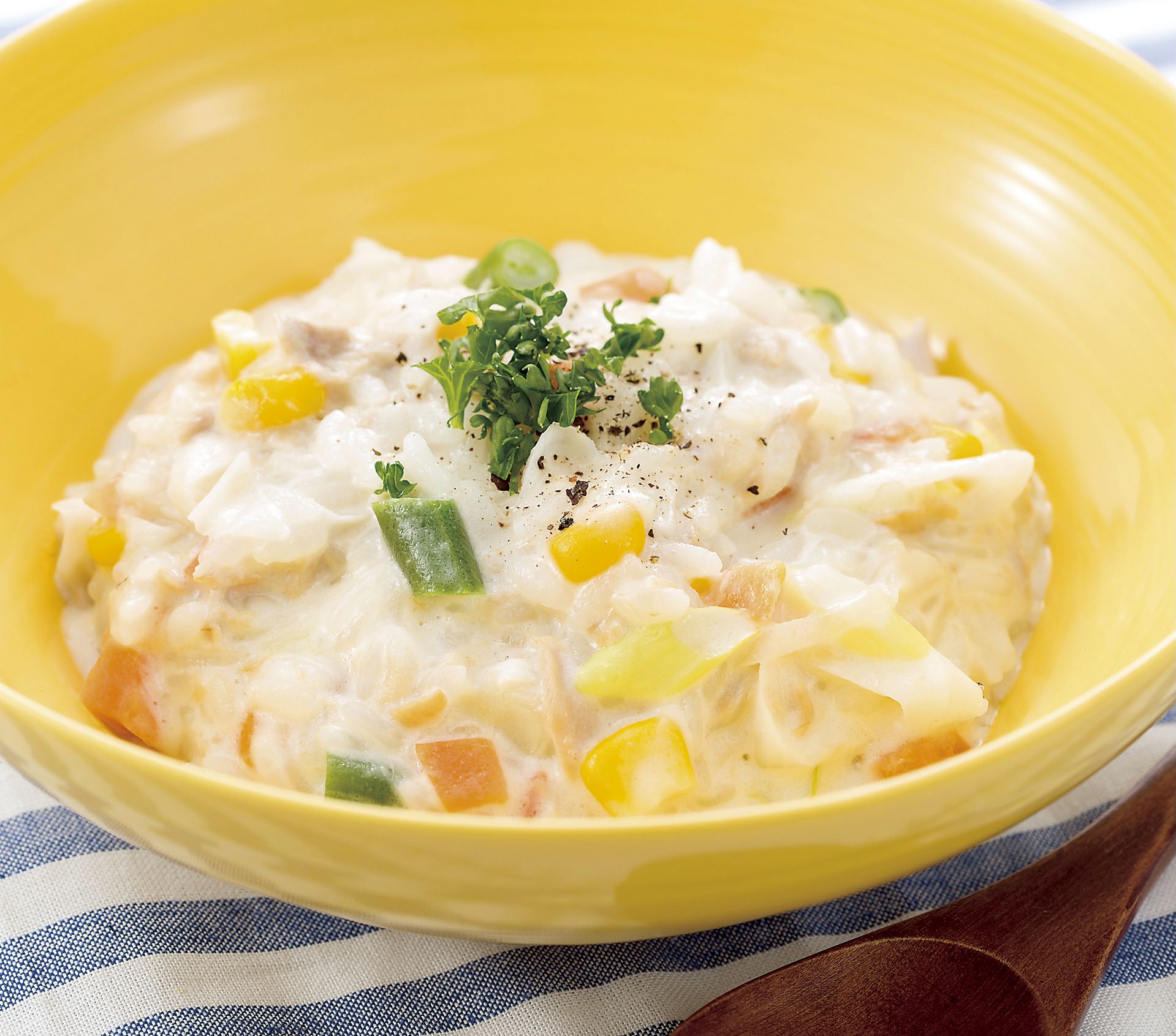 牛乳200ml、ツナ缶小1缶、長ねぎ1本、ご飯2膳分、ミックスベジタブル大さじ3、とろけるチーズ適量