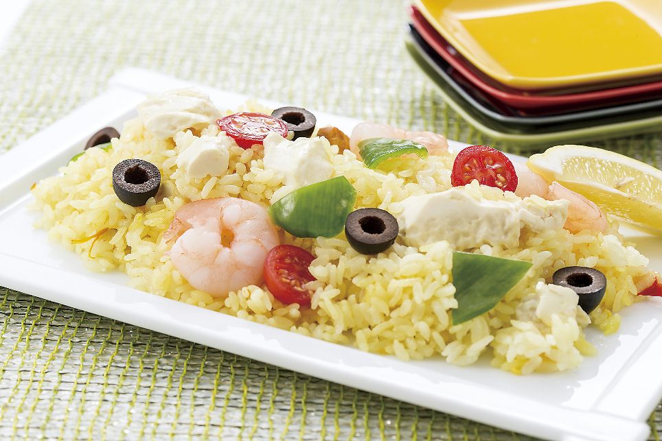 コープ炊き込みパエリアの素1袋、米3合、アイコープにがり充塡とうふ1パック、お好みでエビ・オリーブ・野菜・レモンなど各適量