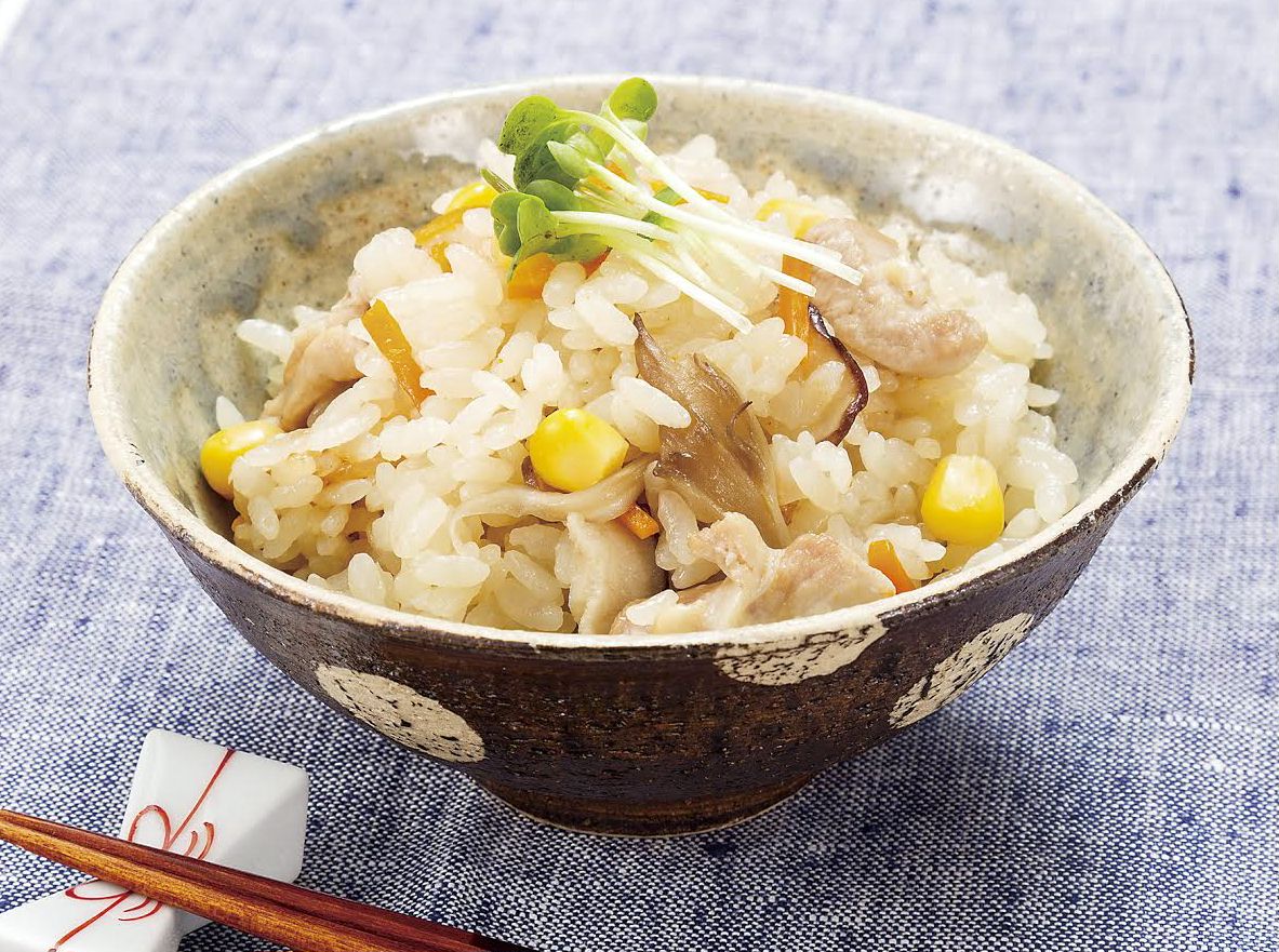 米3合、めんつゆ(3倍)大さじ3、具材(鶏肉・舞茸・椎茸・人参・コーン)各適量
