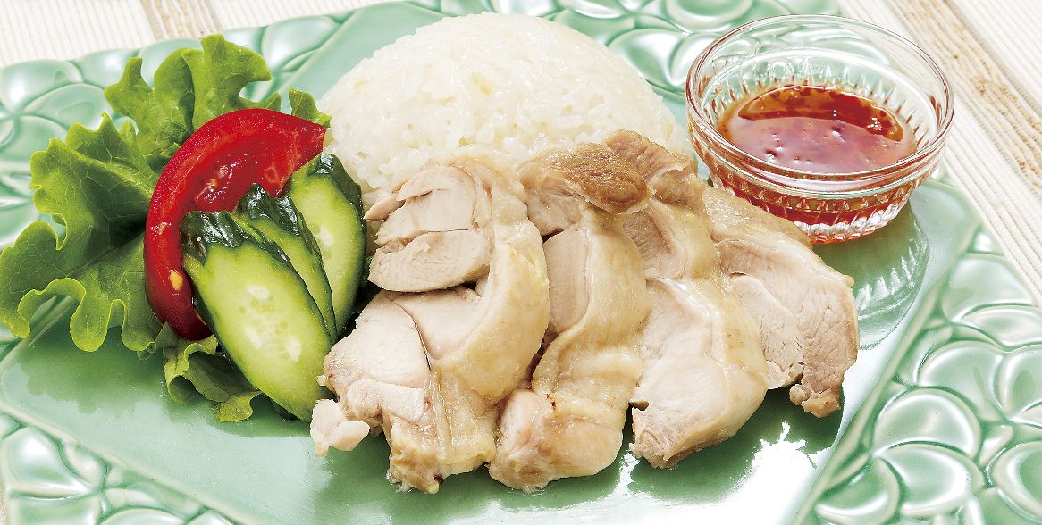 米3合、鶏もも肉2枚、鶏がらスープ600㏄、にんにく・生姜各1かけ、トマト・きゅうり各適量、チリソース適宜