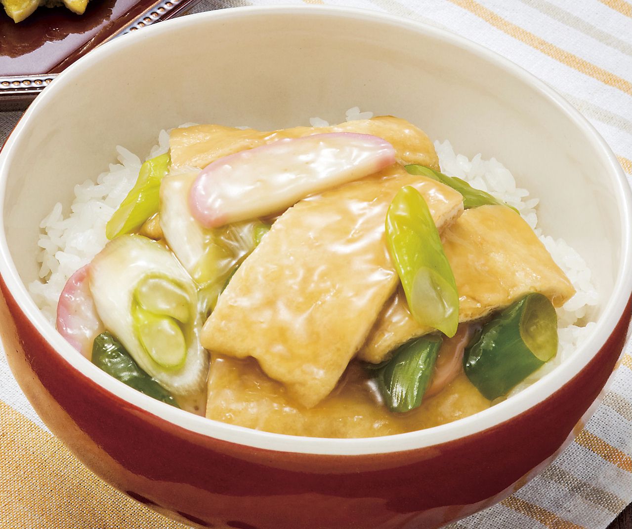 アイコープ県産大豆手揚げ1枚、長ねぎ1/2本、かまぼこ8切れ、だしつゆ大さじ3、砂糖大さじ2、水溶き片栗粉適量、ごはん適量