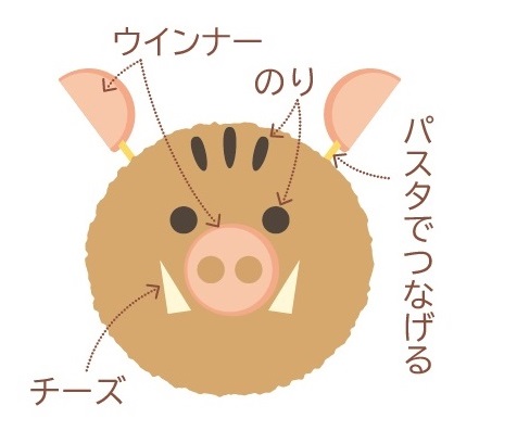 1)ウインナーは両端を切り落とし8等分の輪切りにする。うち4枚は半分に切る(耳)。もう4枚はストローで穴を2つ開ける(鼻)。スライスチーズは8枚の直角三角形に切る(牙)。のりは円形と細長い形に切る(目とたてがみ)。