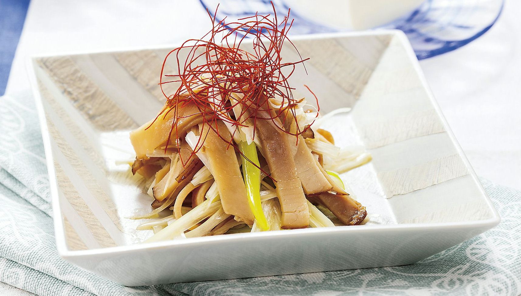 1)焼豚は5㎜幅に、長ねぎは縦に千切りにする。